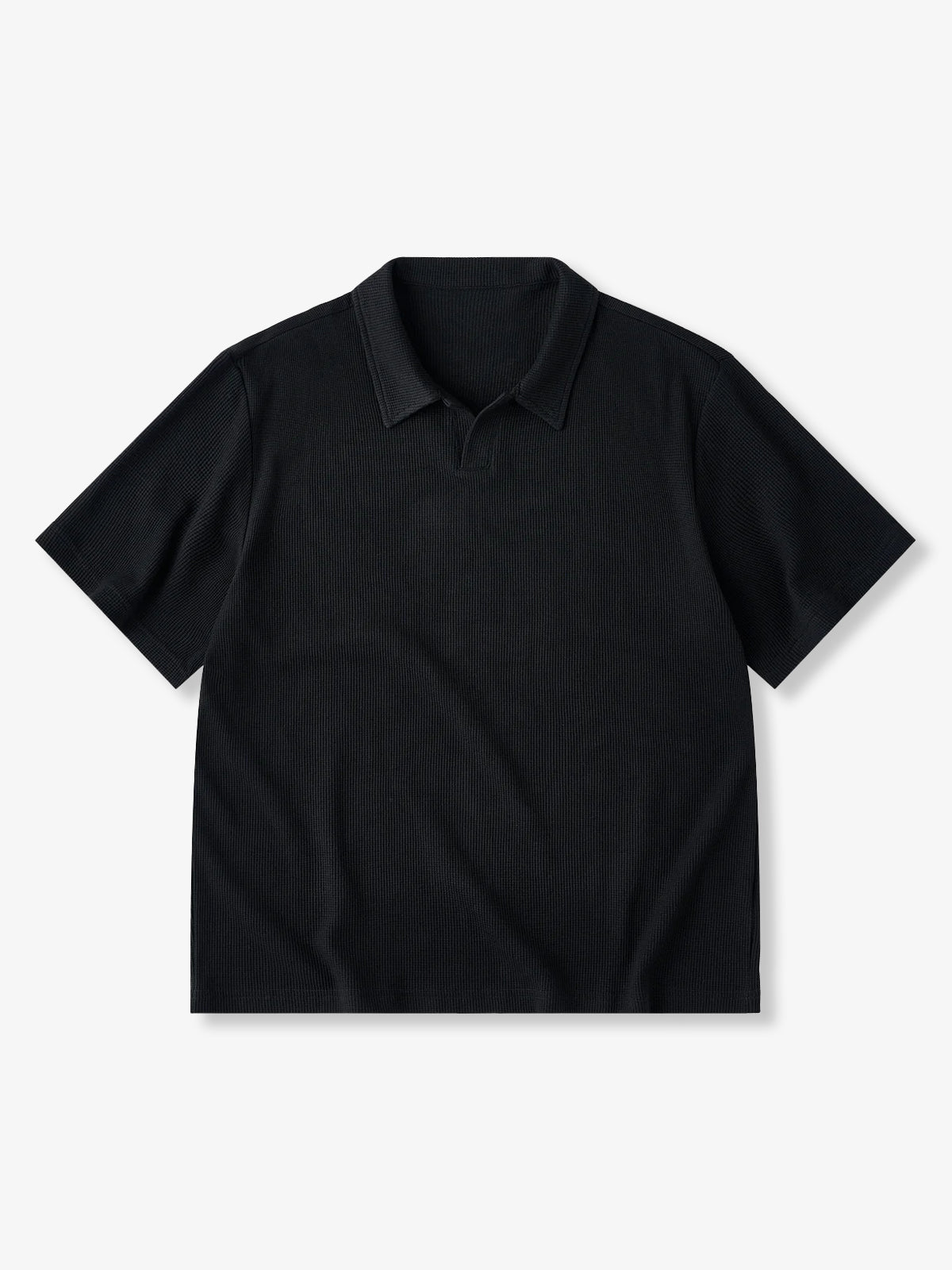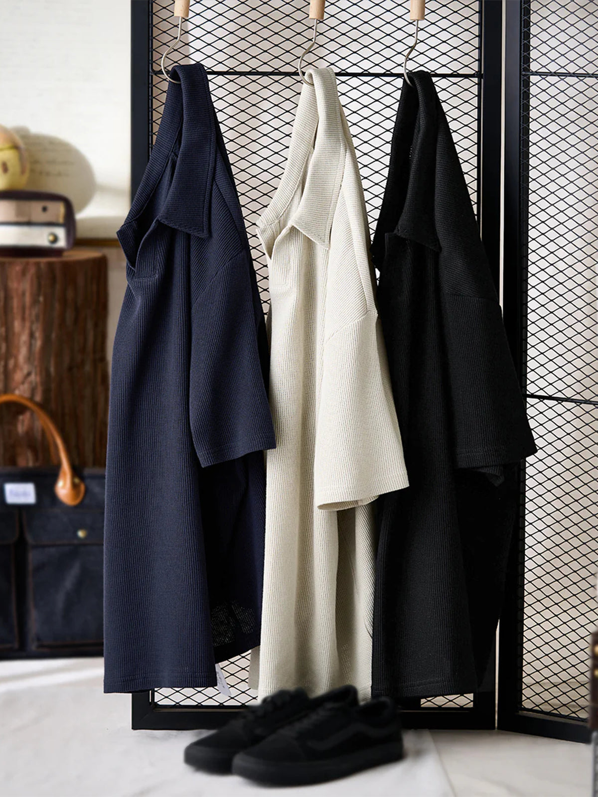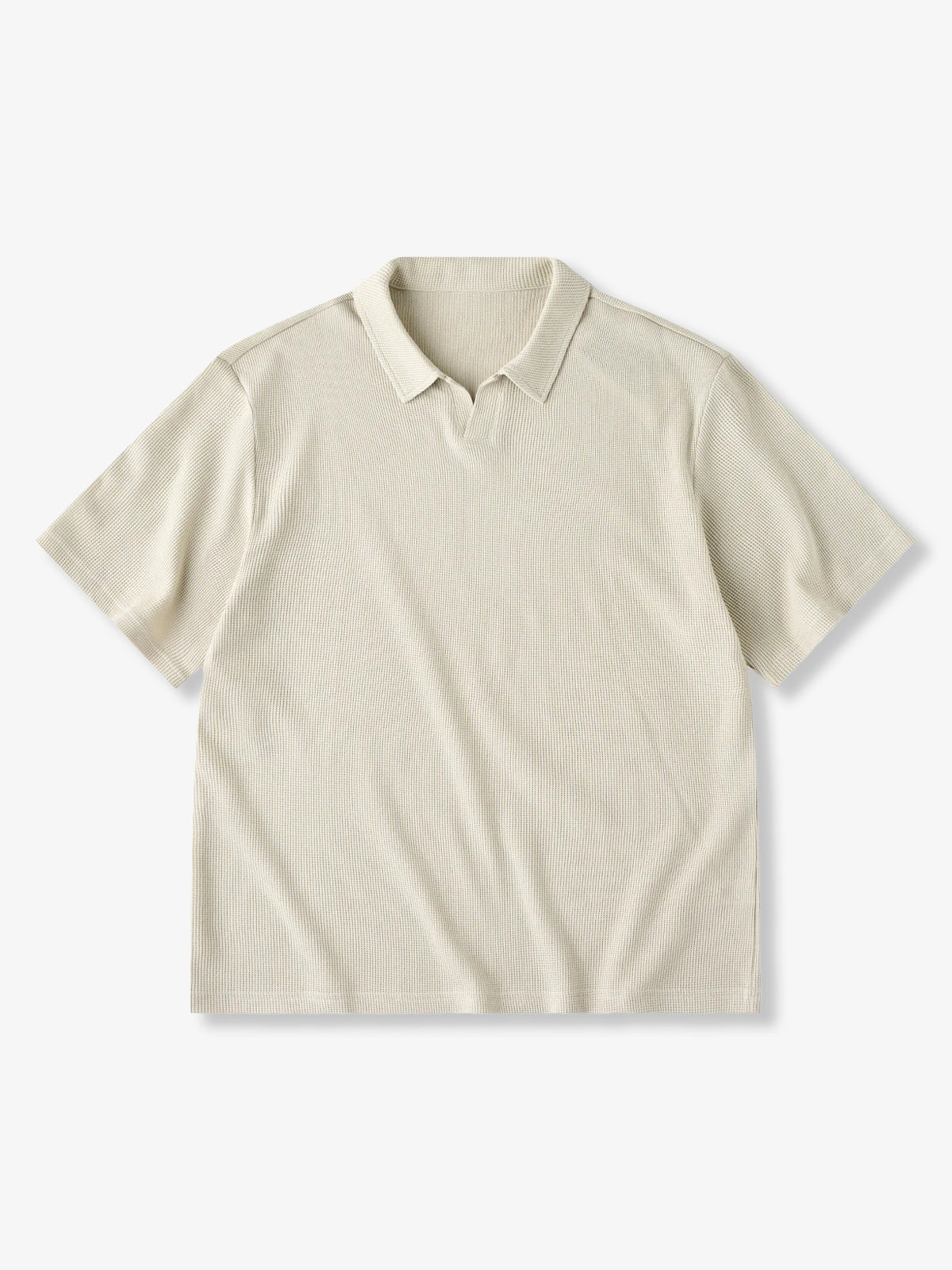 Eliminating the typical buttoned placket of a standard polo shirt, this design offers a more minimal and casual impression. The refined collar retains a hint of formality, creating a relaxed yet composed look. The textured waffle-knit fabric features a three-dimensional surface that is visually and tactilely engaging.