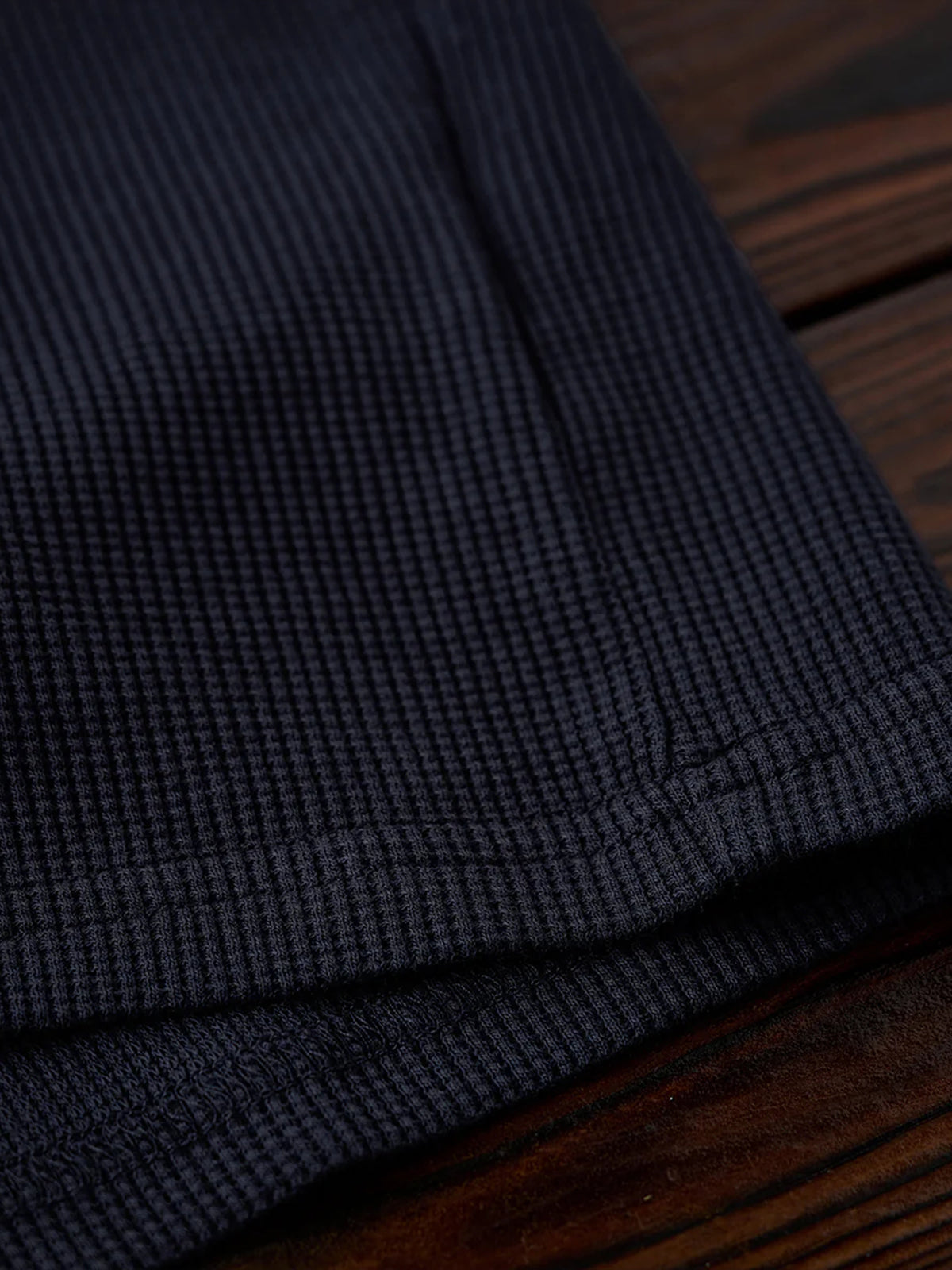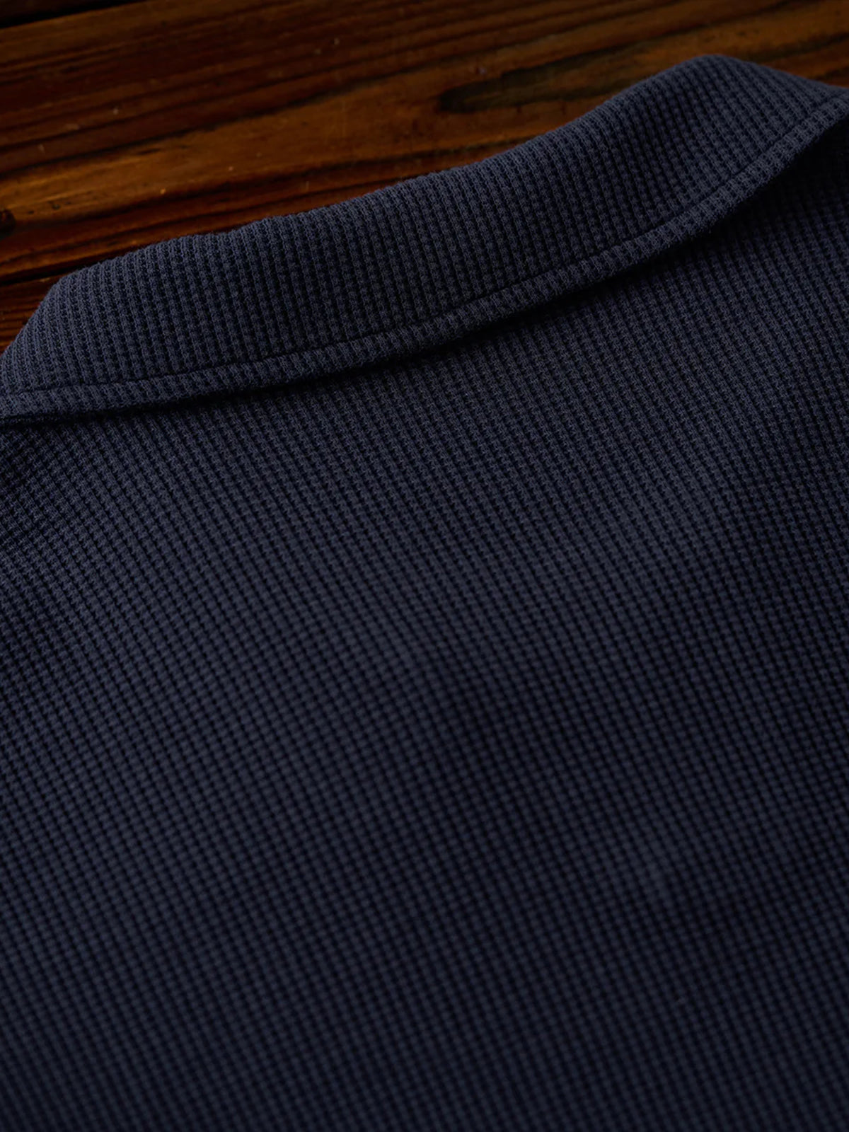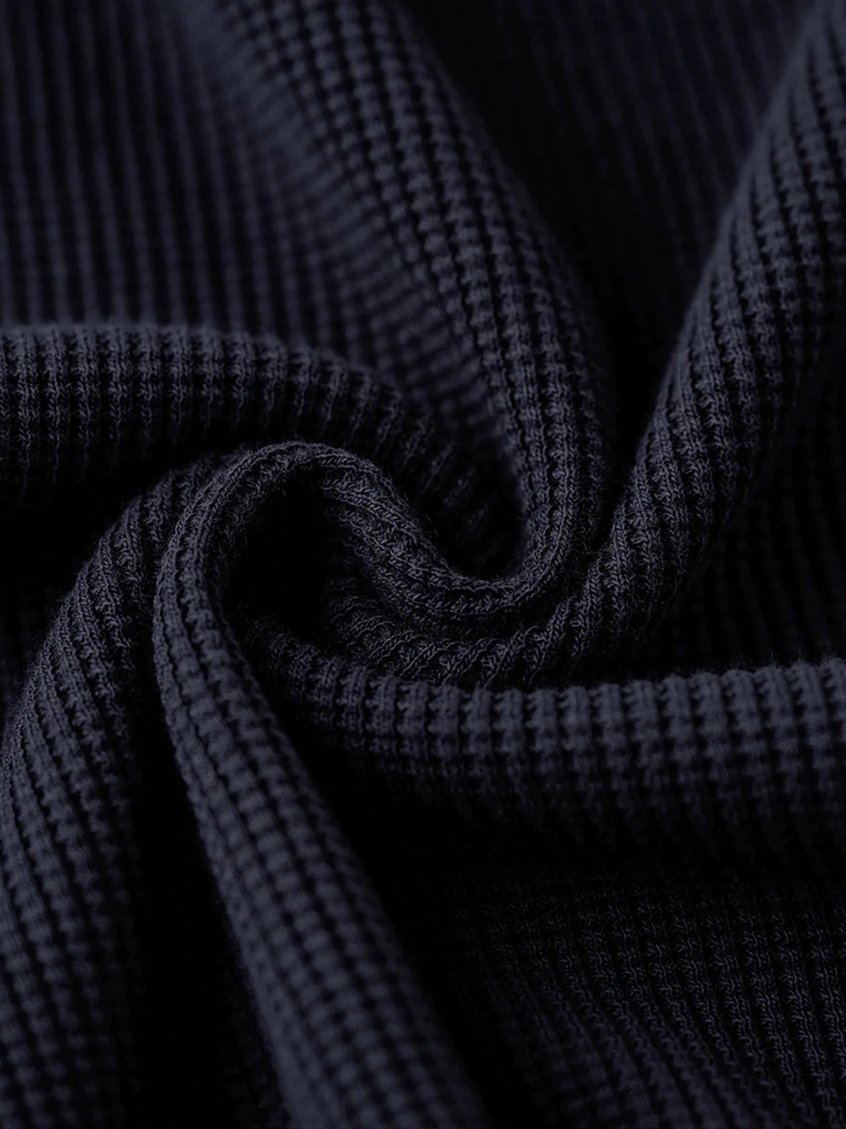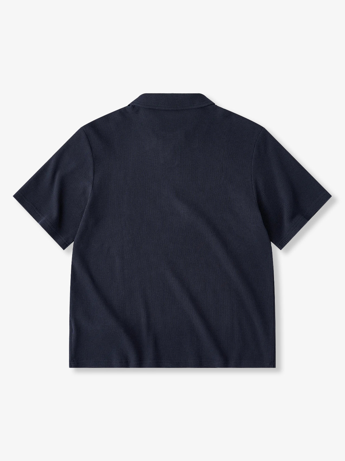 Eliminating the typical buttoned placket of a standard polo shirt, this design offers a more minimal and casual impression. The refined collar retains a hint of formality, creating a relaxed yet composed look. The textured waffle-knit fabric features a three-dimensional surface that is visually and tactilely engaging.
