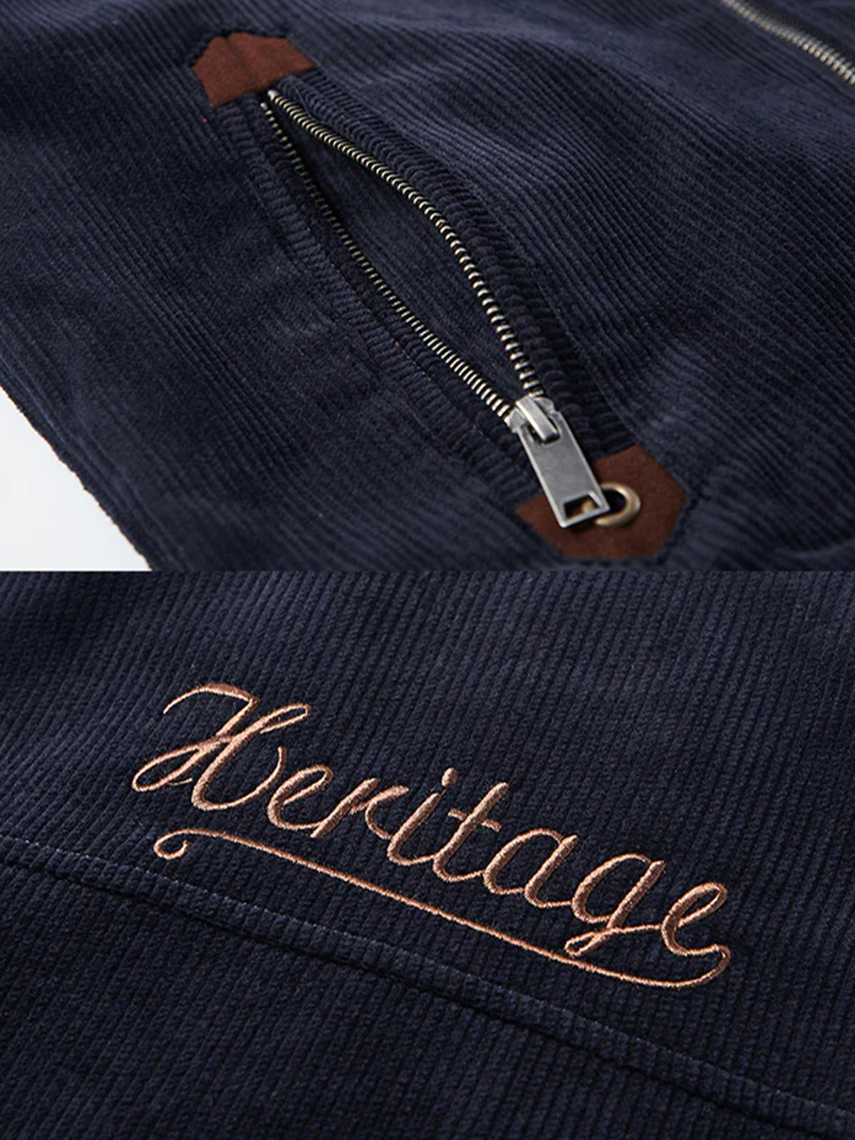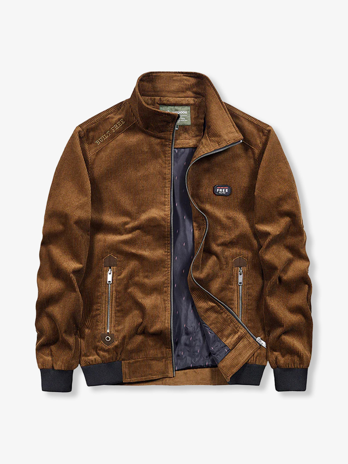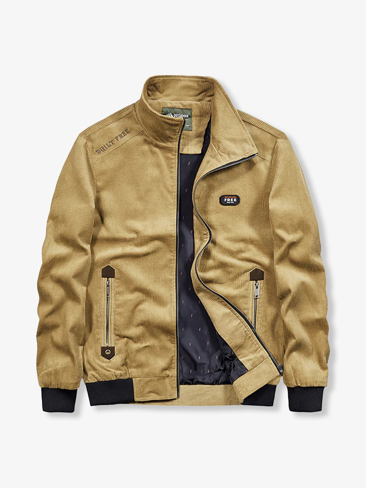 This corduroy jacket balances a rugged workwear taste with casual appeal through its design featuring Velcro patches and letter embroidery. Available in calm color variations such as coffee, khaki, and blue. The included Velcro patch allows for personalized customization. The embroidered lettering on the right shoulder and back also adds unique charm. Ribs at the sleeves and hem, along with the flaps, block outside air and help keep warmth inside the jacket.