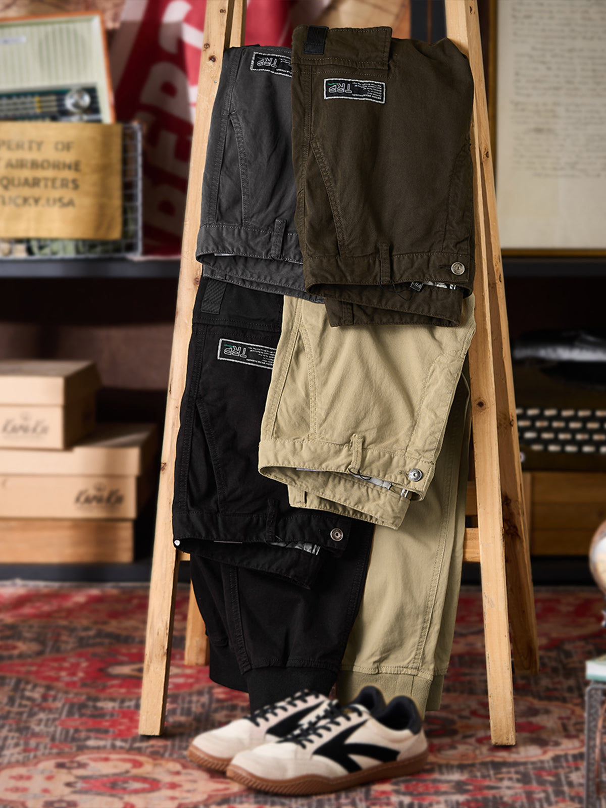 You may not be familiar with the name, but parachute pants were originally worn by troops who parachuted into enemy territory. Designed for ease of movement, these pants feature a loose-fitting silhouette and cuffed hems to keep wind out—signature details of classic military gear.
