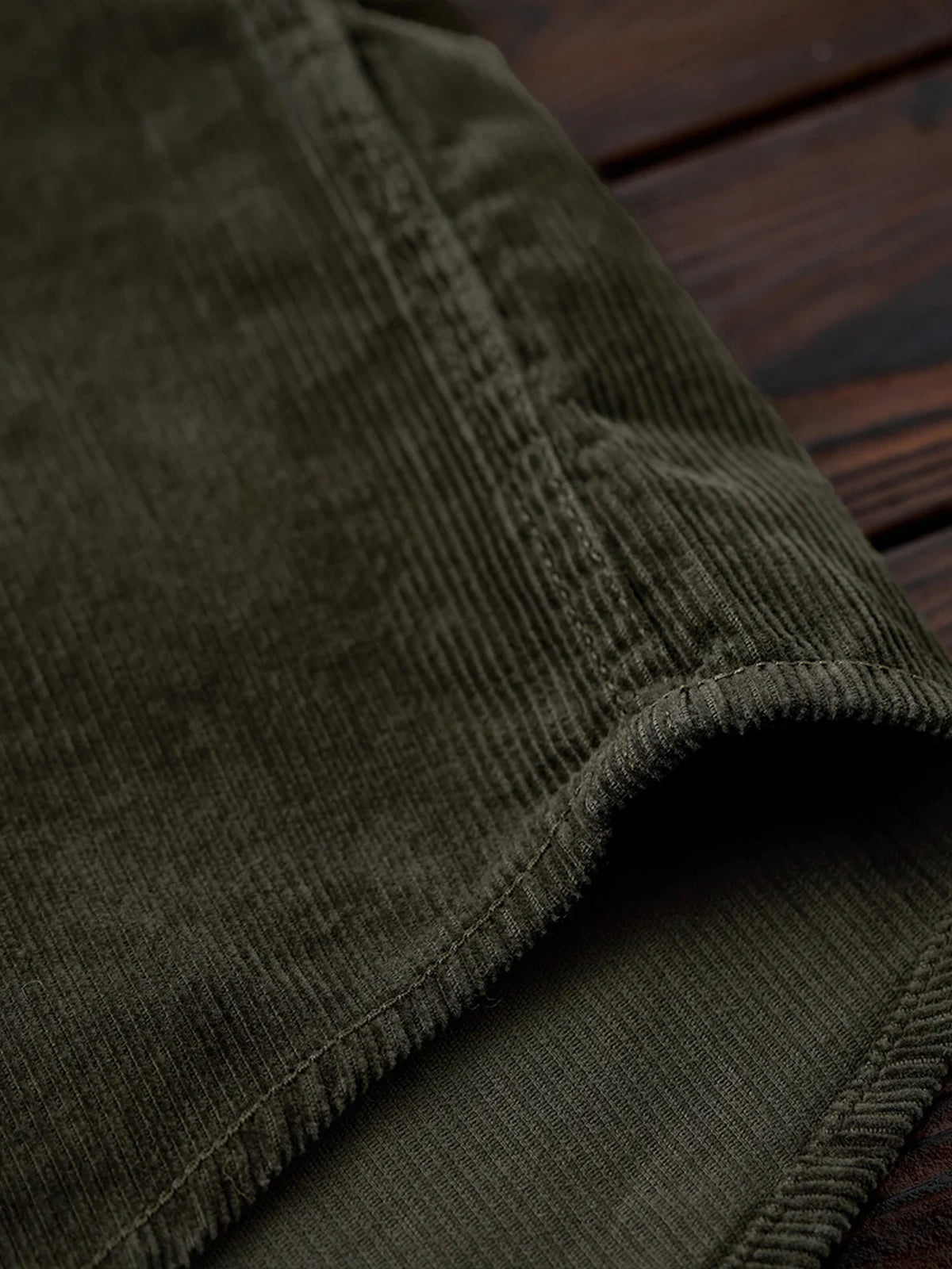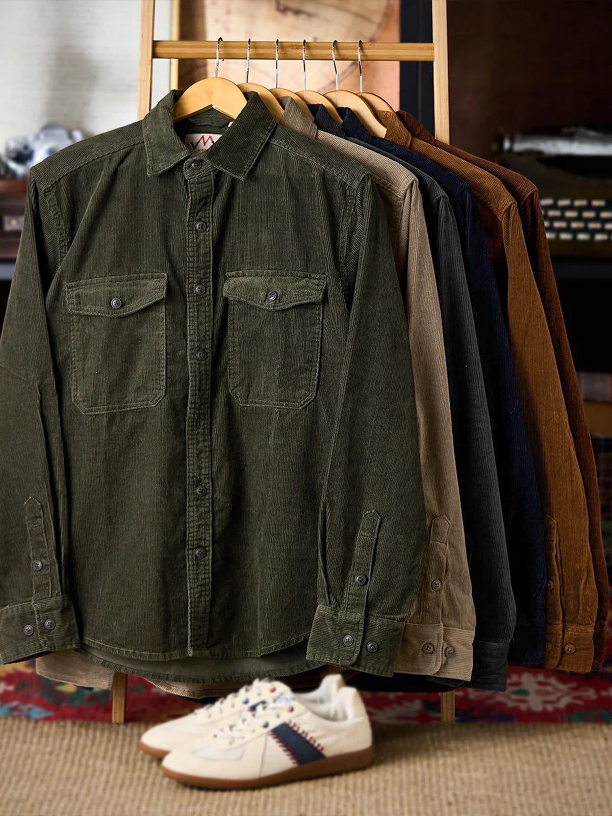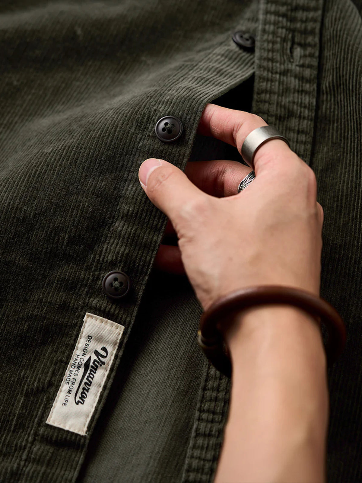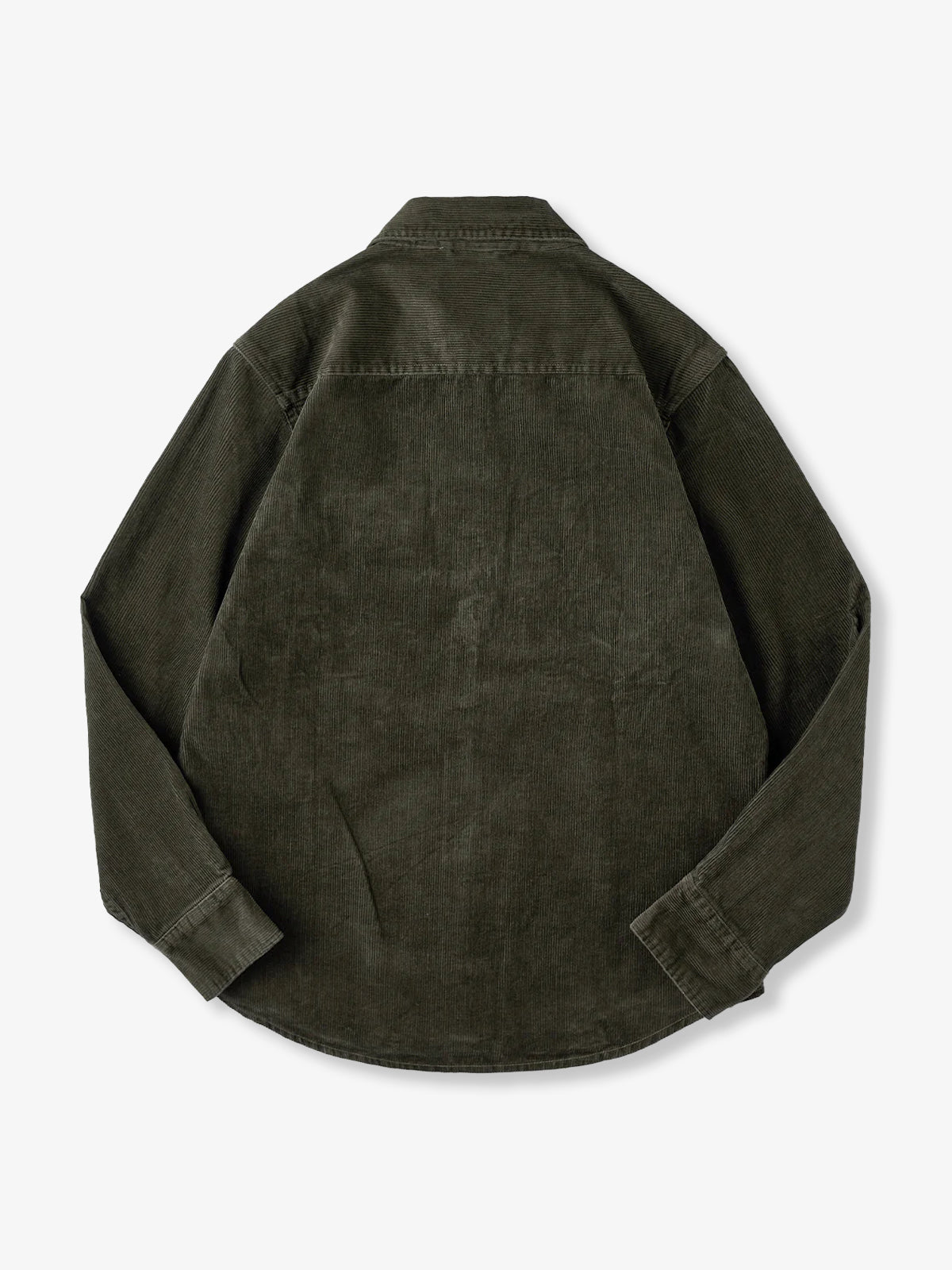 A long-sleeve shirt with work pockets, made from corduroy fabric that offers a warm and inviting texture. The fine-wale corduroy creates a three-dimensional effect that adds depth to the simple design, developing more character the more it is worn. The front features work pockets that combine practicality with a design accent. Balanced to avoid appearing too rugged, this shirt maintains a workwear aesthetic while remaining suitable for everyday wear. It works well as a standalone piece or as a light layering option. Available in multiple colors, allowing you to choose according to outfit or mood. A reliable classic shirt that adds natural warmth and texture to fall and winter styling.