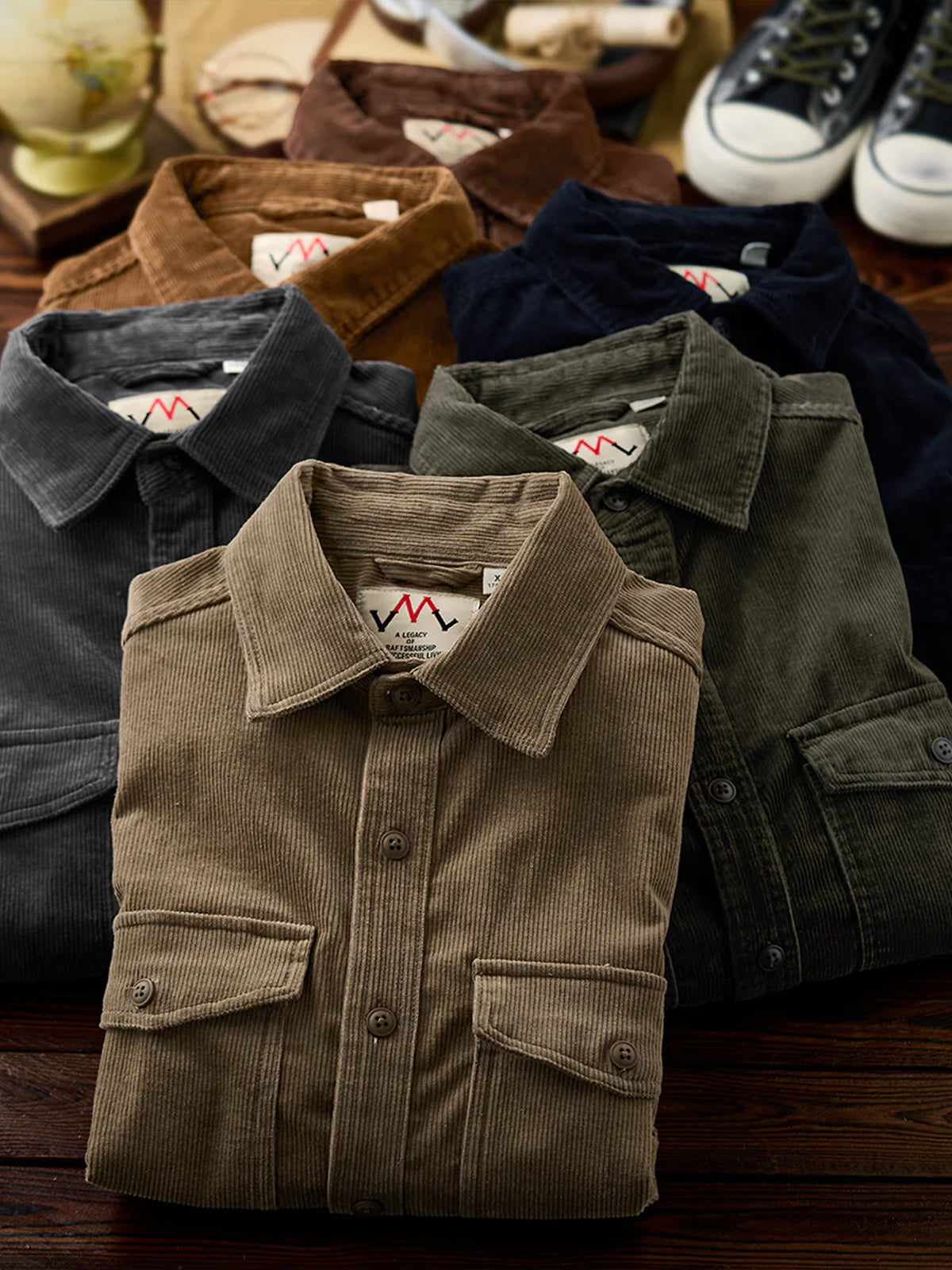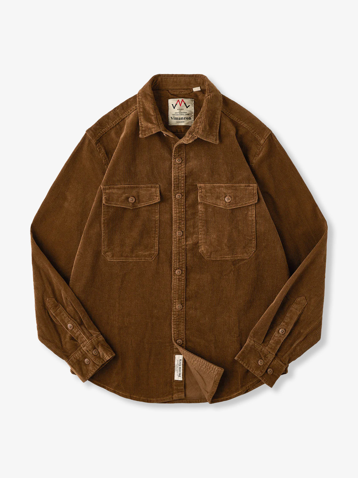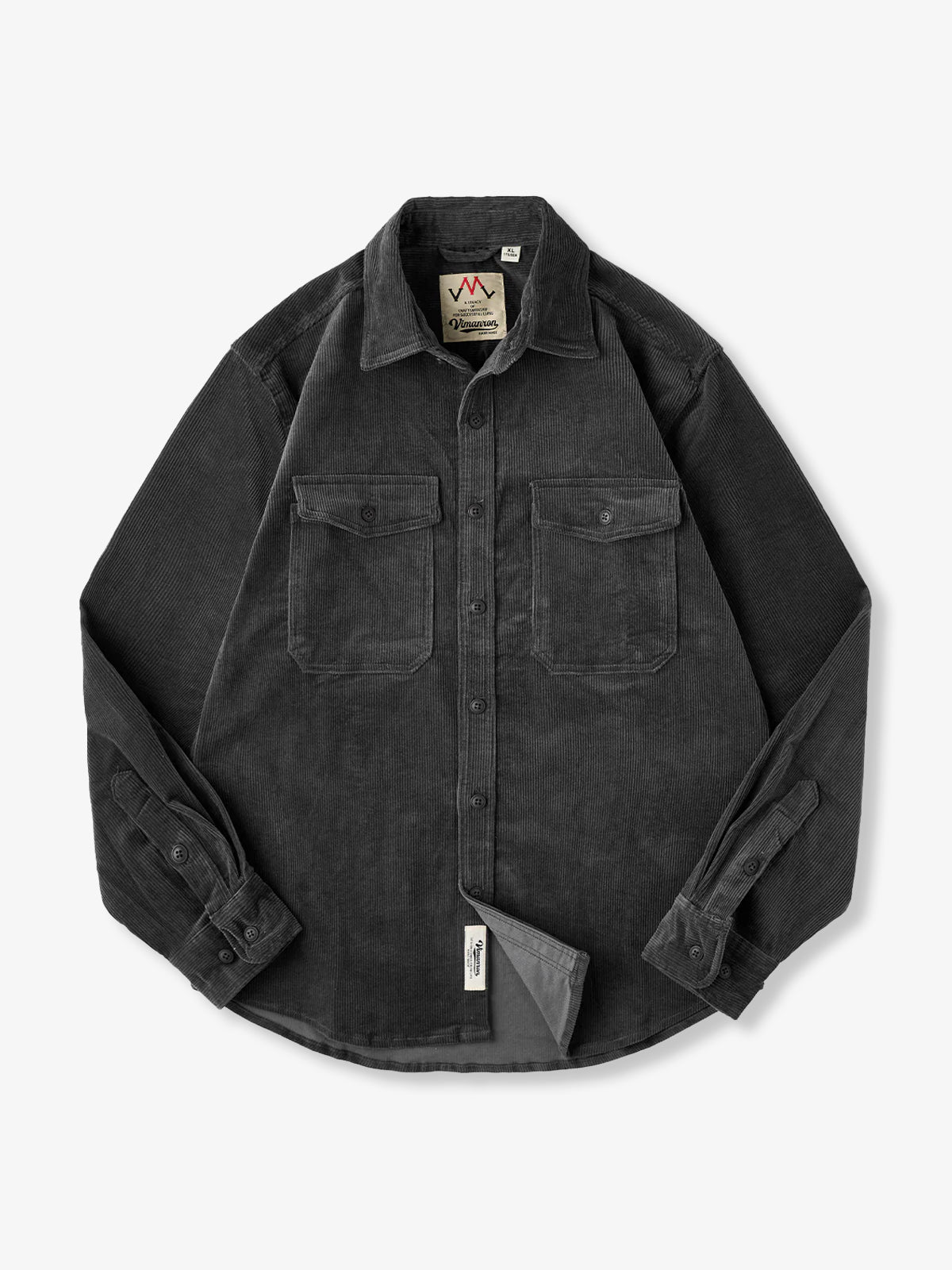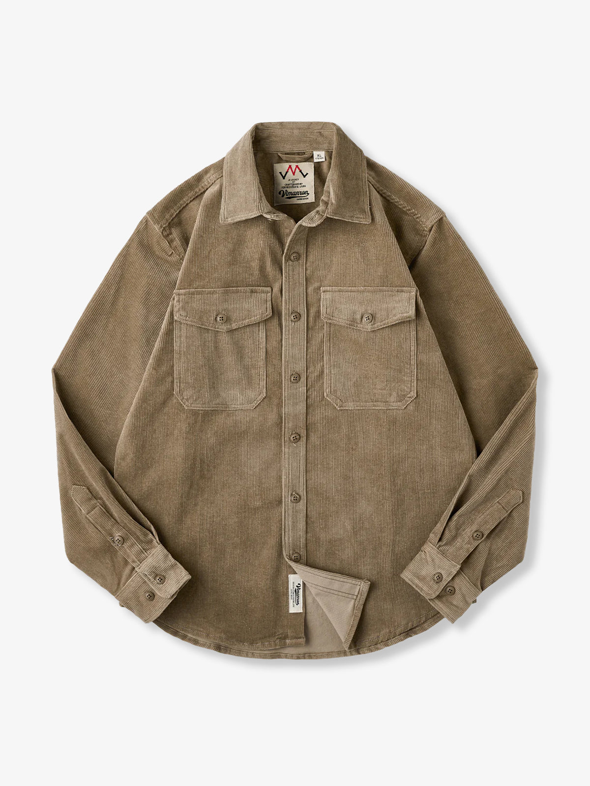 A long-sleeve shirt with work pockets, made from corduroy fabric that offers a warm and inviting texture. The fine-wale corduroy creates a three-dimensional effect that adds depth to the simple design, developing more character the more it is worn. The front features work pockets that combine practicality with a design accent. Balanced to avoid appearing too rugged, this shirt maintains a workwear aesthetic while remaining suitable for everyday wear. It works well as a standalone piece or as a light layering option. Available in multiple colors, allowing you to choose according to outfit or mood. A reliable classic shirt that adds natural warmth and texture to fall and winter styling.