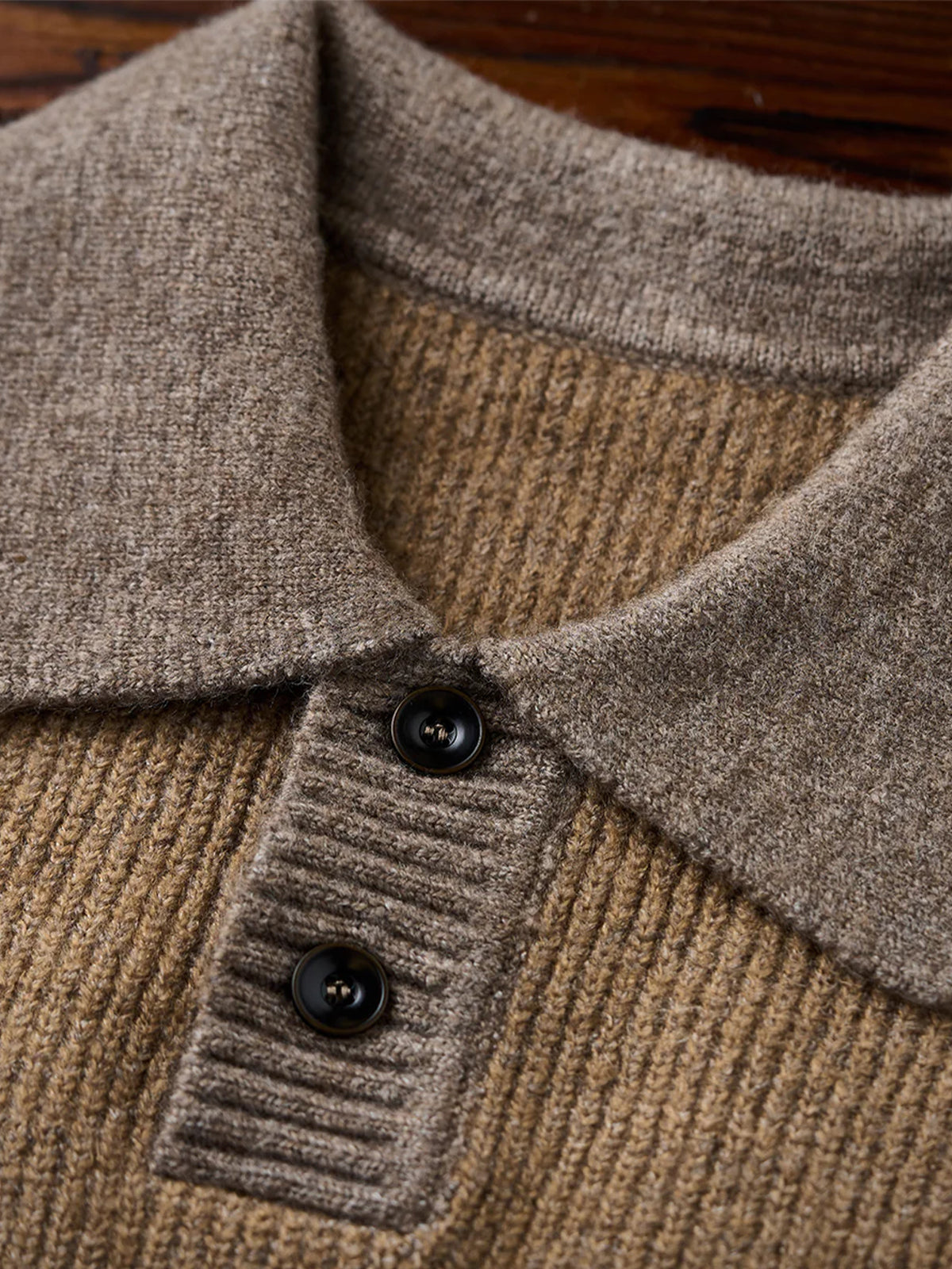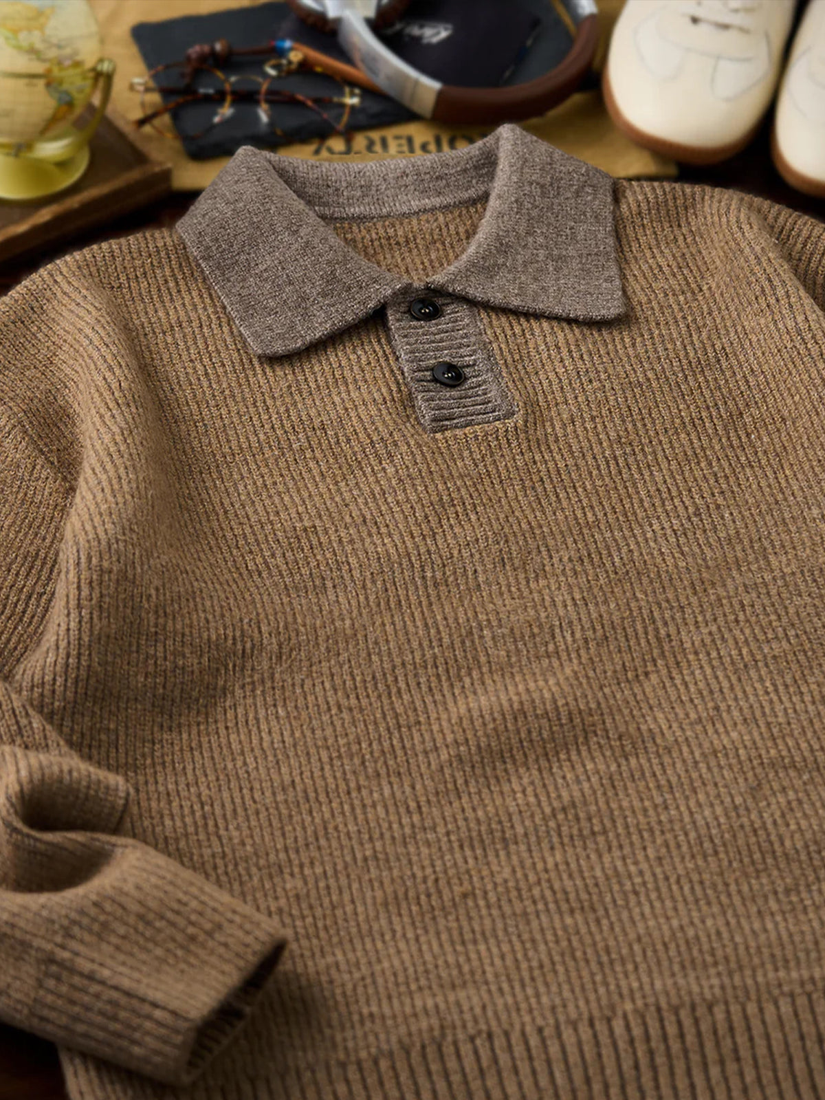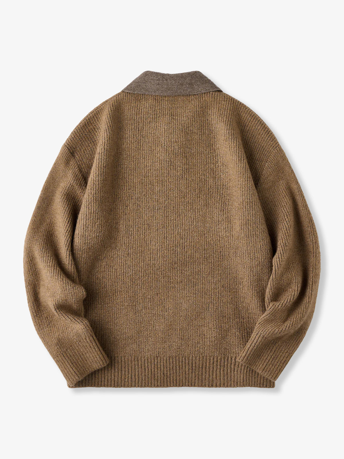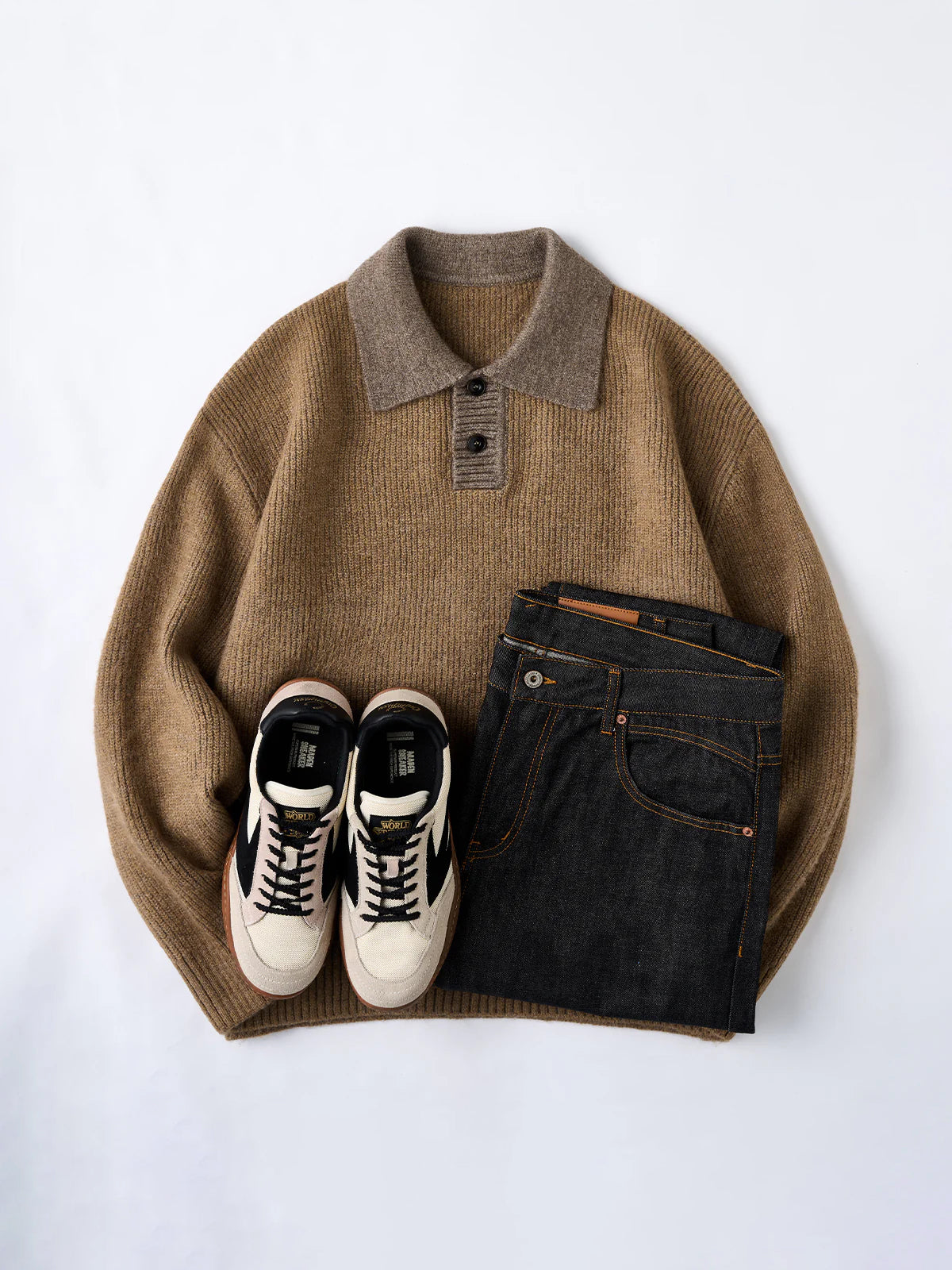 A classic polo collar is used, giving a calm and composed impression. It offers a style that sits between casual and formal, making it suitable for various situations. The buttons feature a wood-like design, adding a natural atmosphere. The ribbed cuffs and hem enhance the fit while also providing functionality to protect against the cold. The finishing on the sleeves and hem is done carefully, giving the whole piece a high-quality appearance. The drop-shoulder construction provides a relaxed silhouette with extra room around the shoulders, incorporating a modern trend.