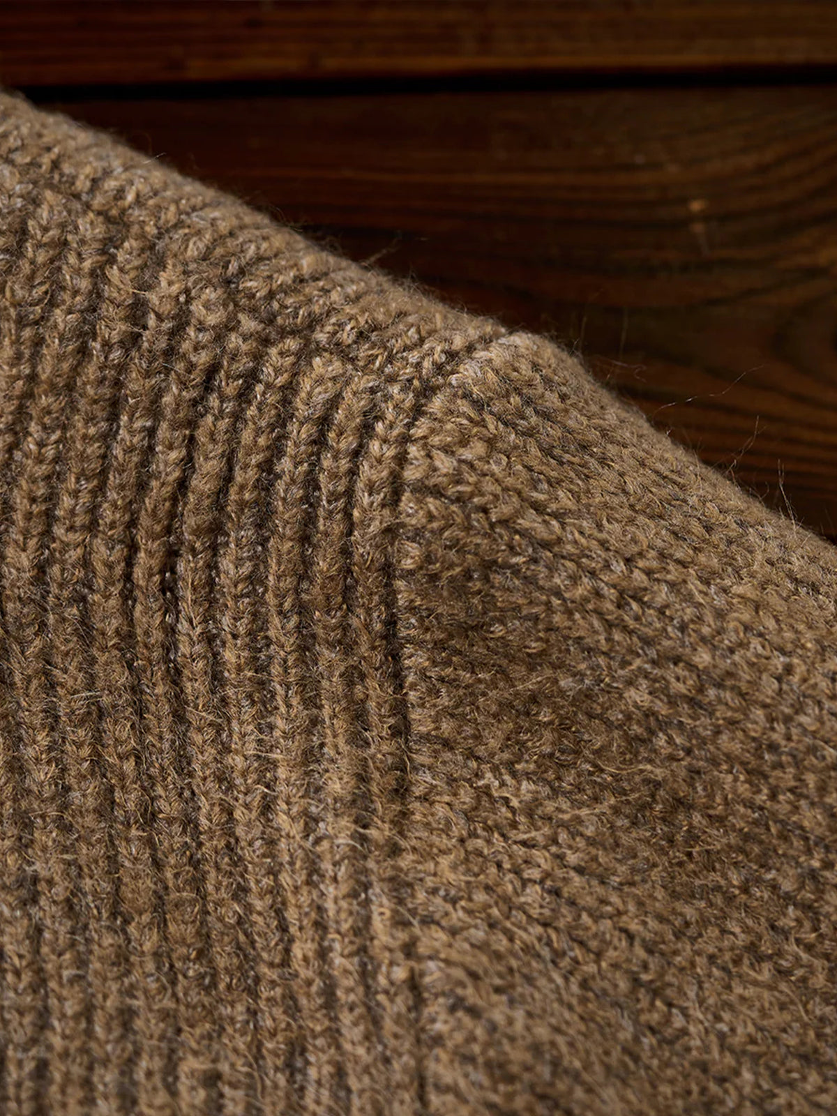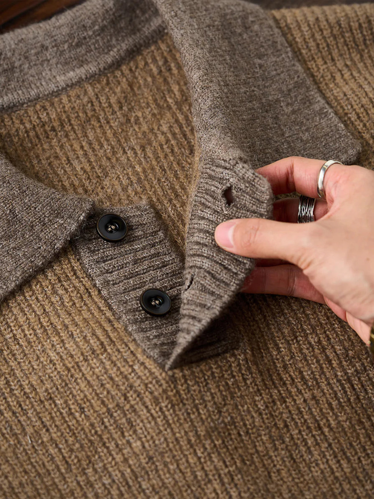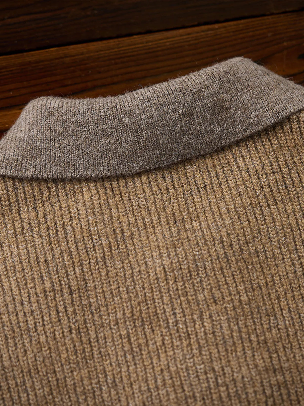 A classic polo collar is used, giving a calm and composed impression. It offers a style that sits between casual and formal, making it suitable for various situations. The buttons feature a wood-like design, adding a natural atmosphere. The ribbed cuffs and hem enhance the fit while also providing functionality to protect against the cold. The finishing on the sleeves and hem is done carefully, giving the whole piece a high-quality appearance. The drop-shoulder construction provides a relaxed silhouette with extra room around the shoulders, incorporating a modern trend.