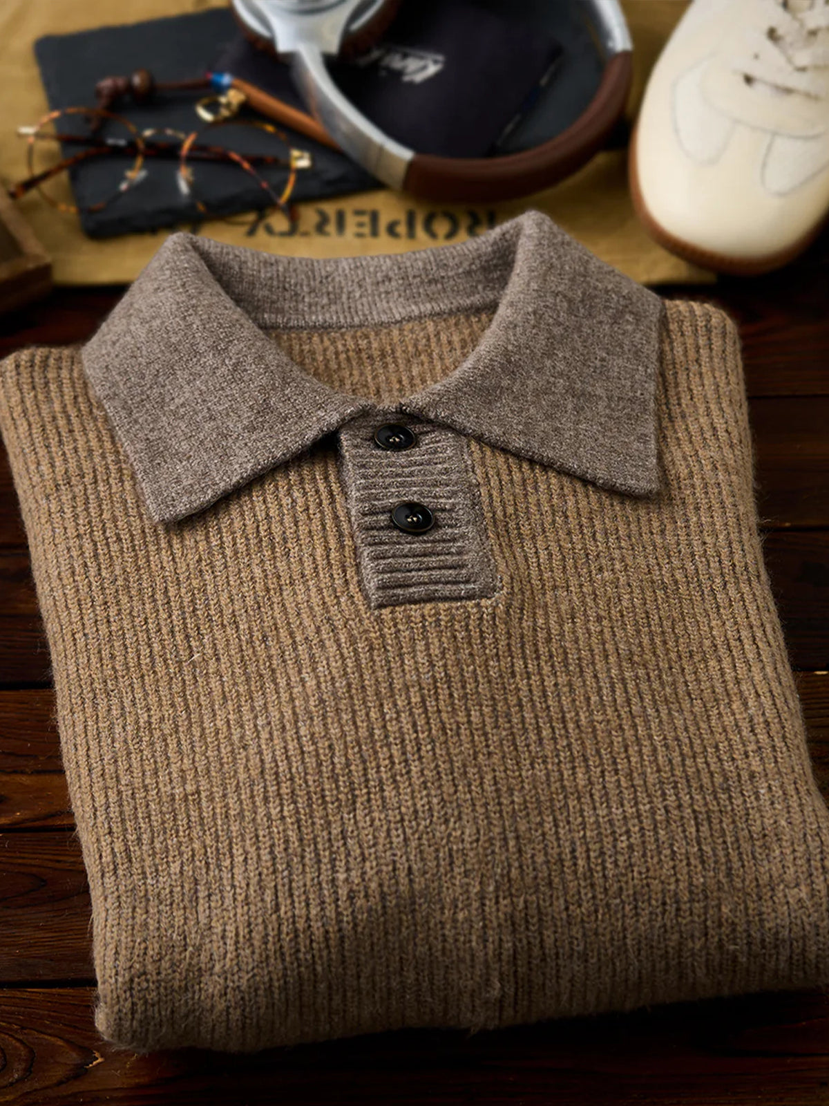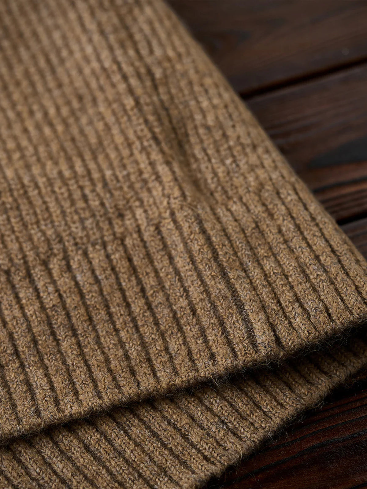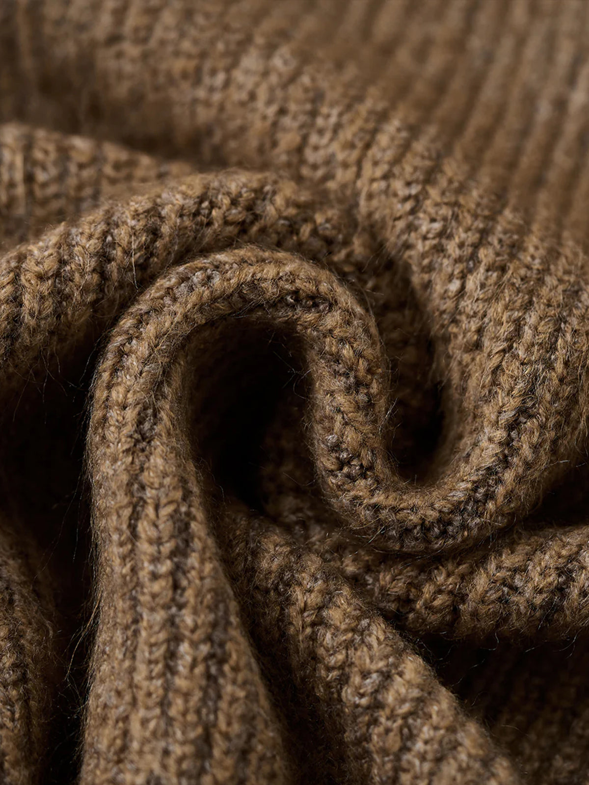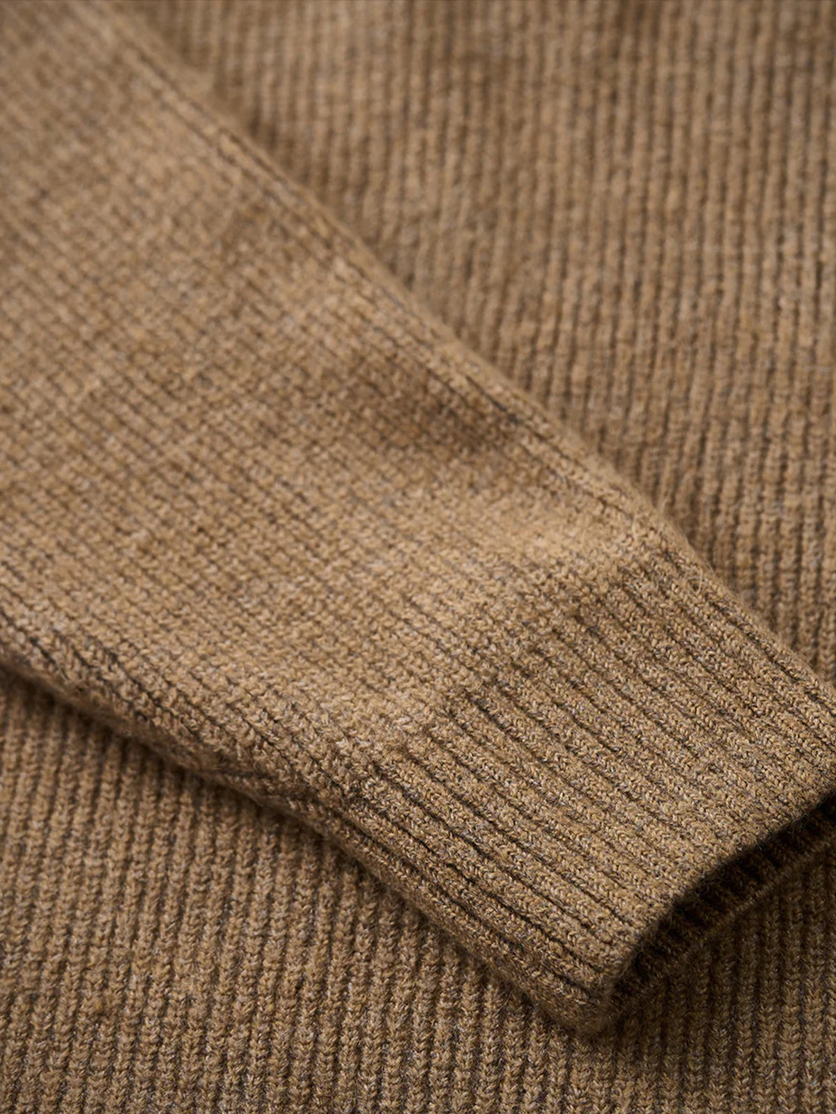 A classic polo collar is used, giving a calm and composed impression. It offers a style that sits between casual and formal, making it suitable for various situations. The buttons feature a wood-like design, adding a natural atmosphere. The ribbed cuffs and hem enhance the fit while also providing functionality to protect against the cold. The finishing on the sleeves and hem is done carefully, giving the whole piece a high-quality appearance. The drop-shoulder construction provides a relaxed silhouette with extra room around the shoulders, incorporating a modern trend.