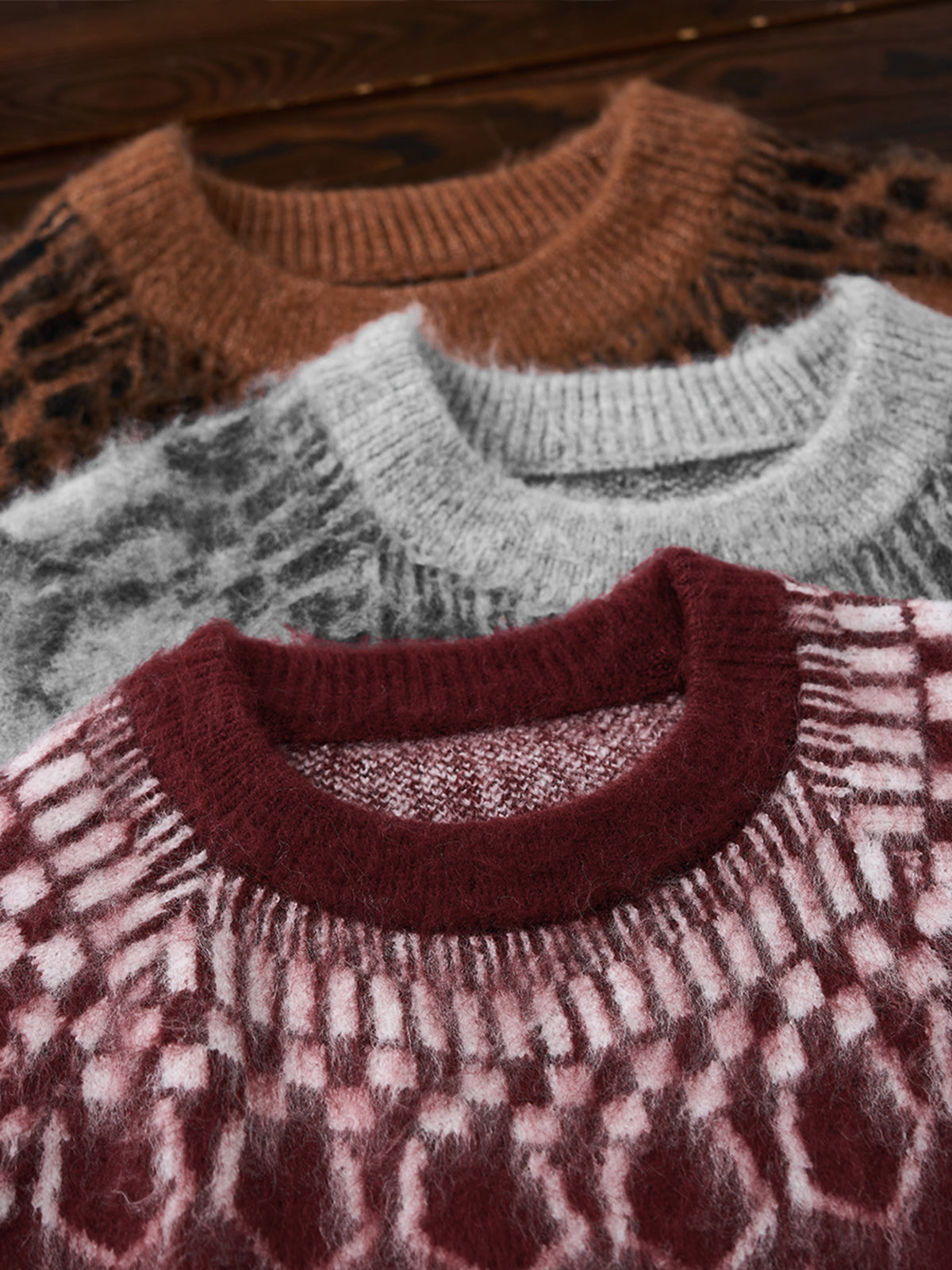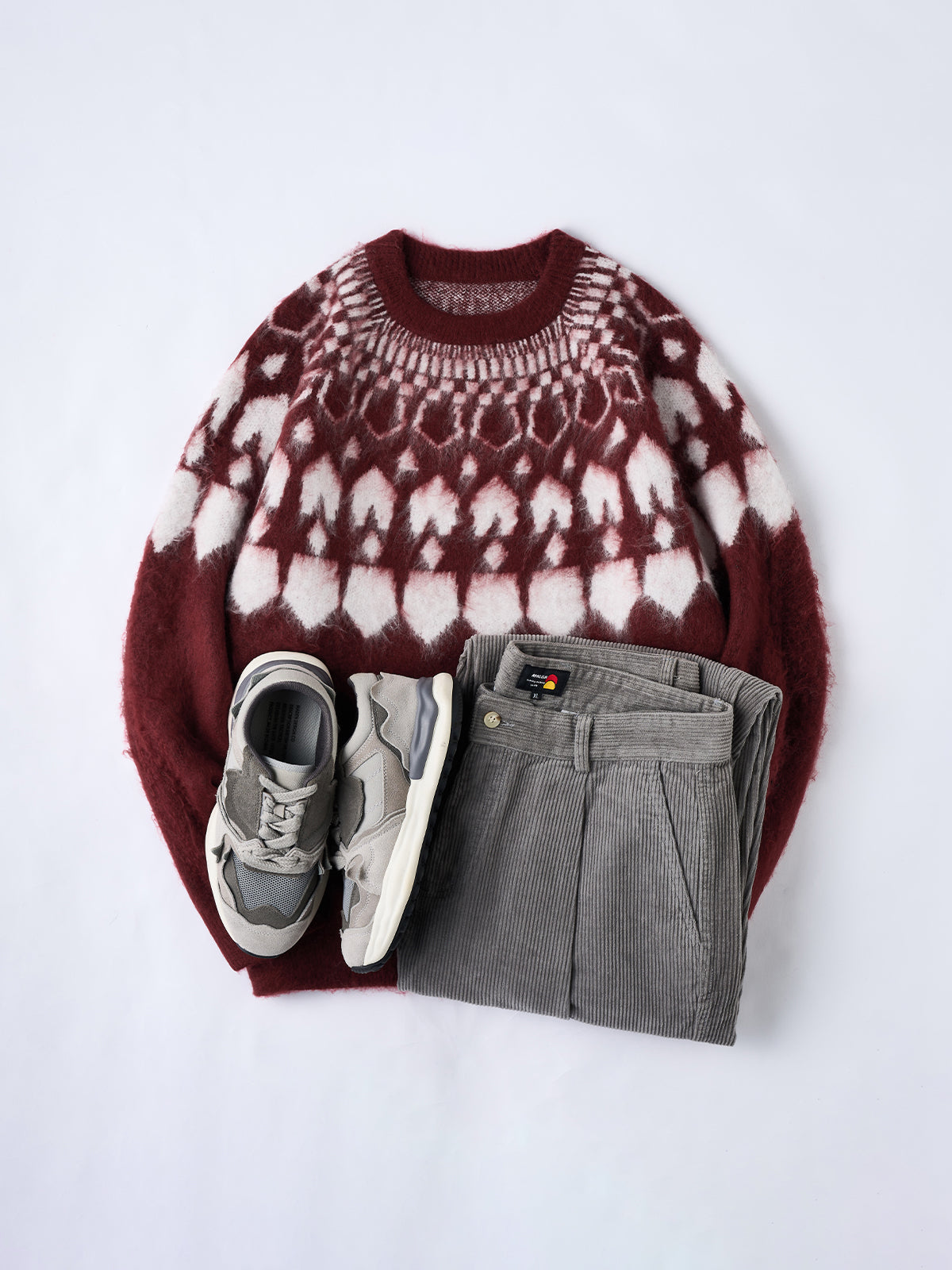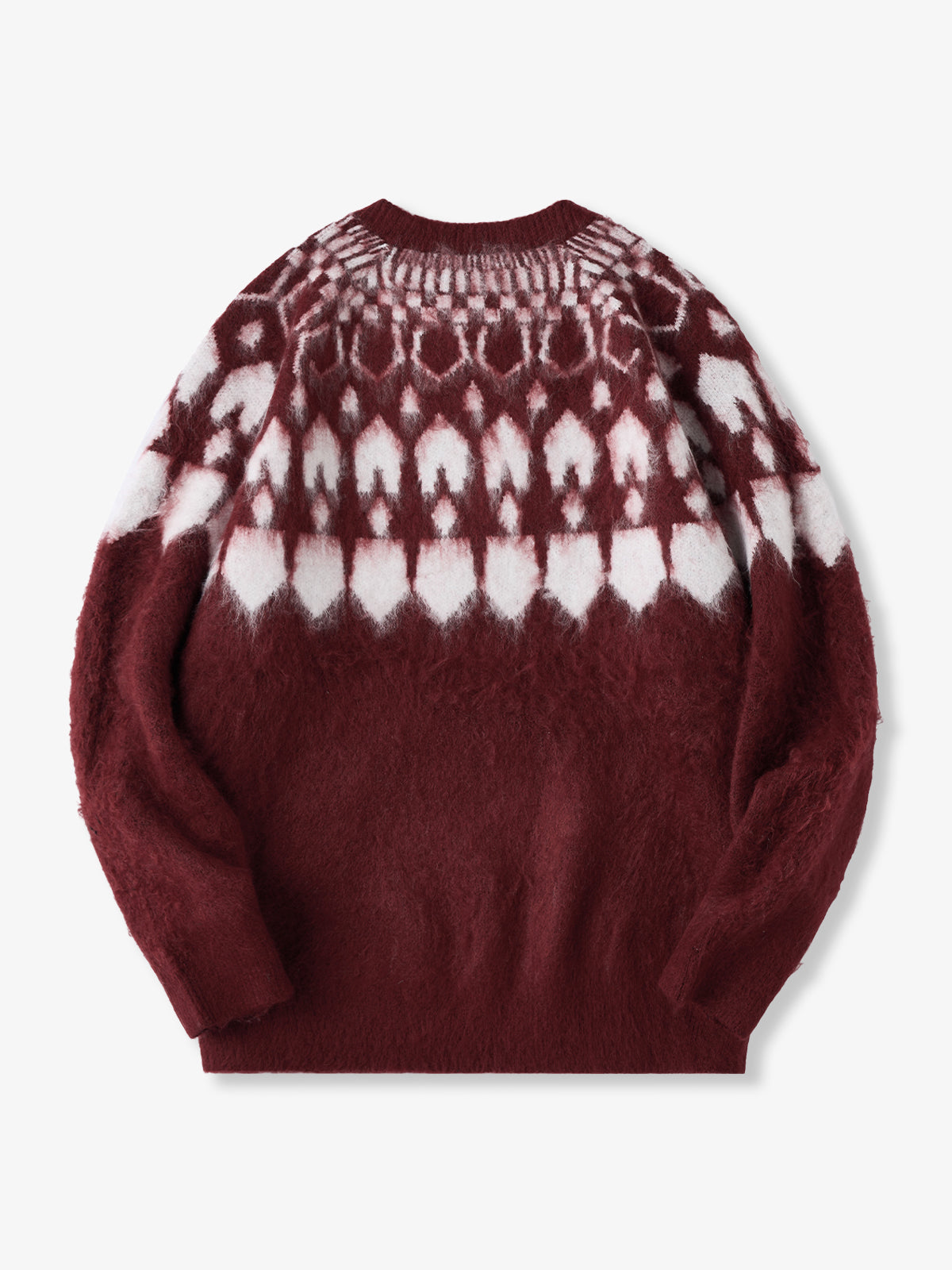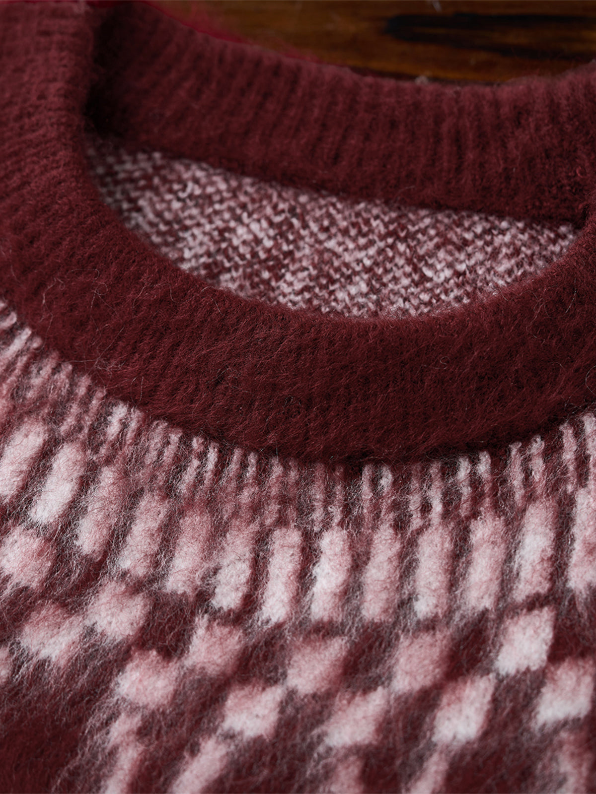 A crewneck knit sweater with a strong presence, featuring a three-dimensional geometric pattern expressed through jacquard weaving. The pattern is orderly yet conveys a sense of warmth, adding a subtle accent to any outfit. The tightly knitted fabric is softer than it appears, providing a comfortable wearing experience. It works well as a statement piece on its own, and the pattern also stands out when worn as an inner layer under outerwear, enriching fall and winter styling. Available in four color options ranging from basic tones to accent colors, it suits both casual and refined looks. From everyday styles paired with denim or chinos to more mature outfits with wool trousers, this versatile piece adapts to a wide range of styling needs.