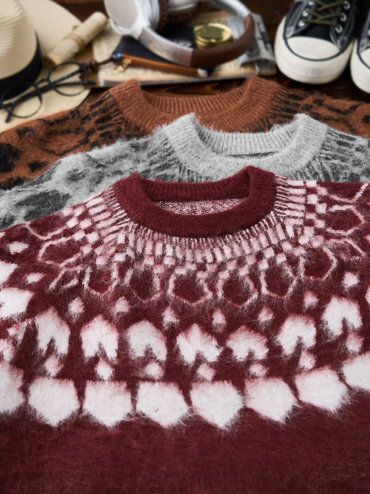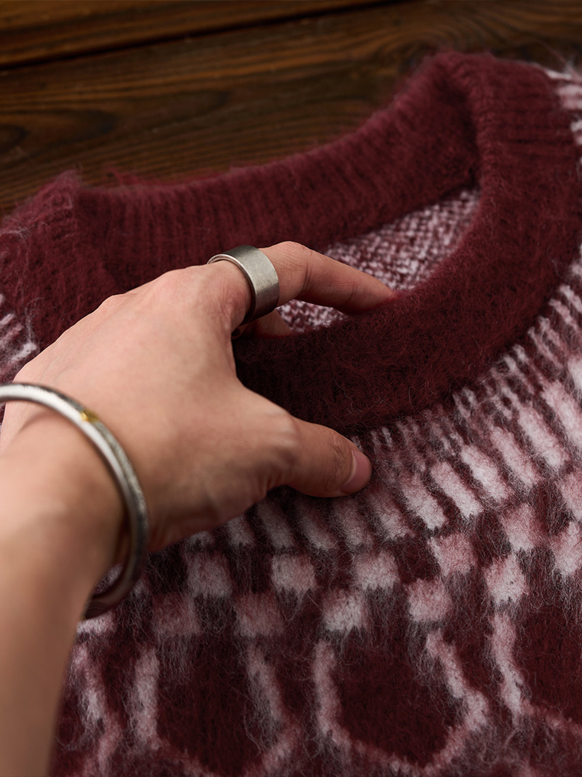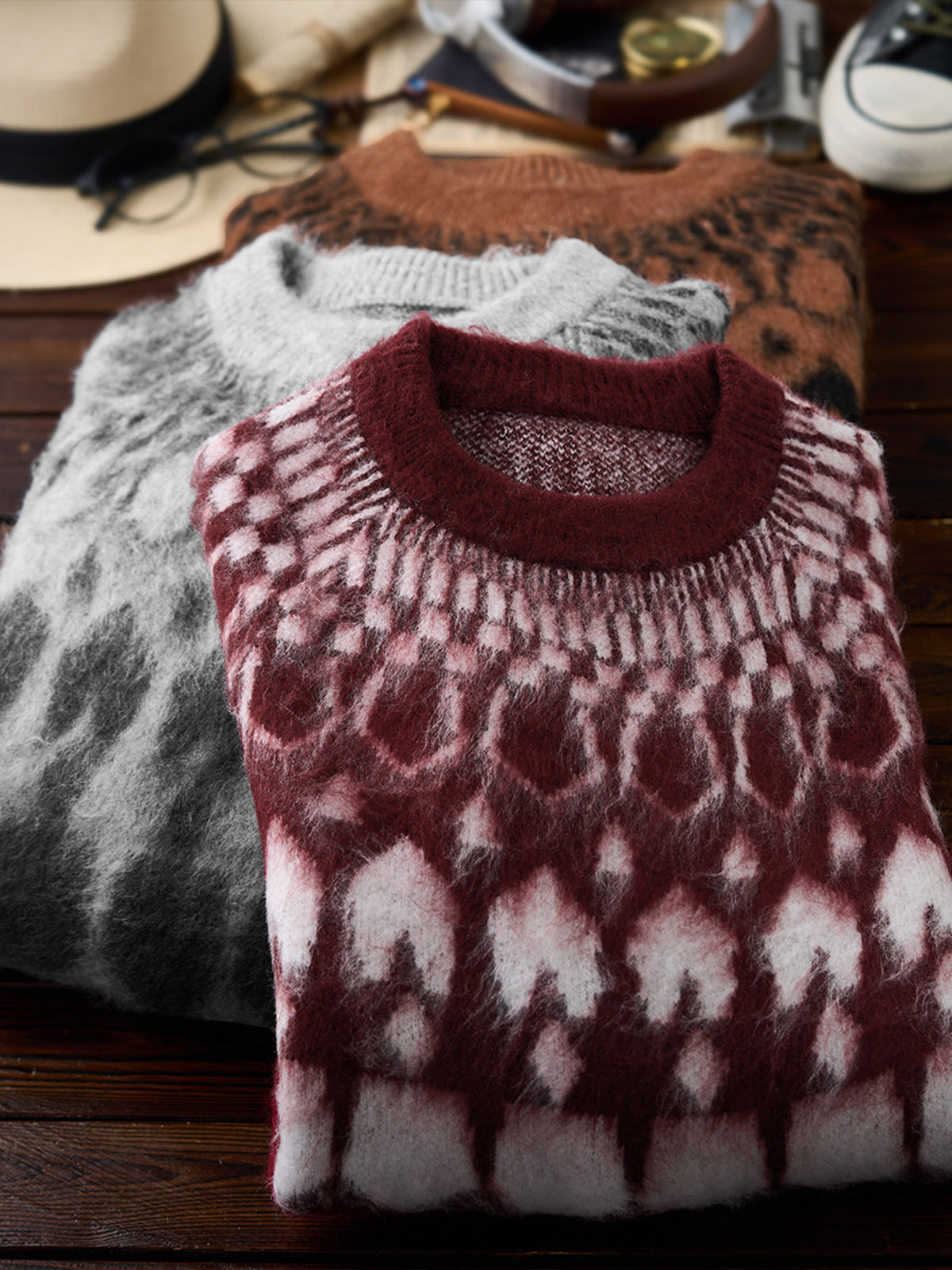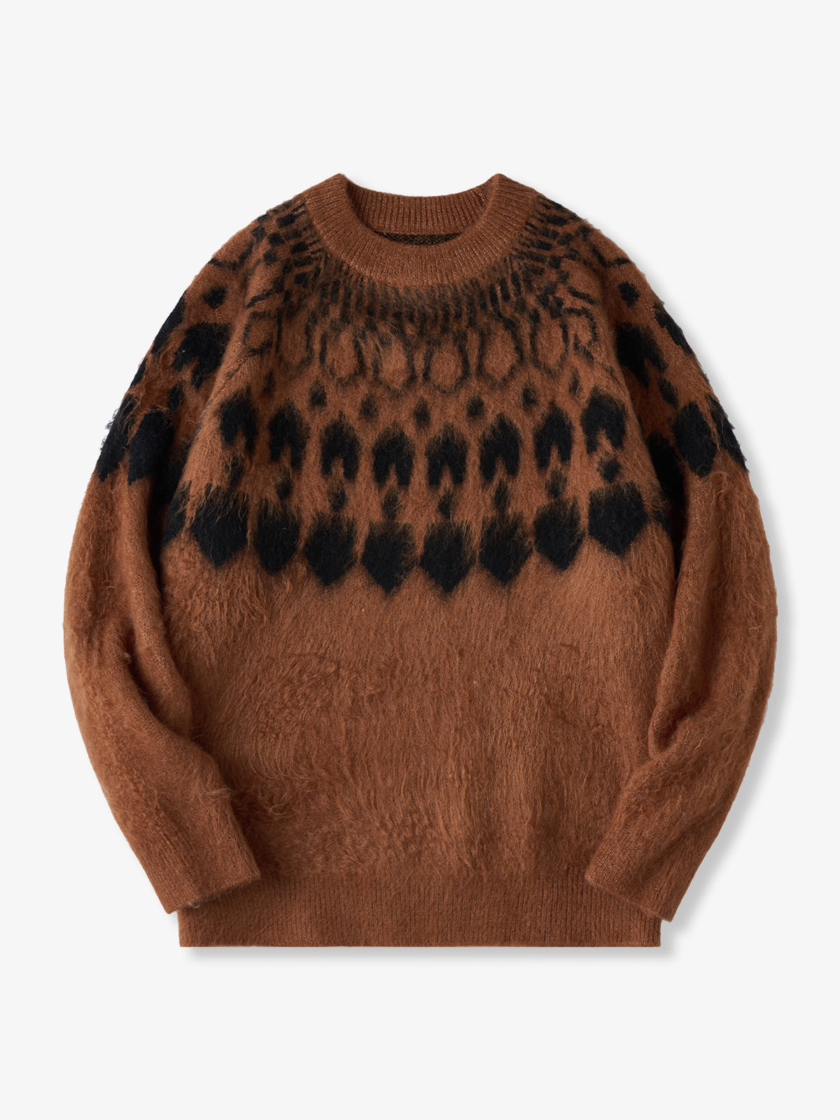 A crewneck knit sweater with a strong presence, featuring a three-dimensional geometric pattern expressed through jacquard weaving. The pattern is orderly yet conveys a sense of warmth, adding a subtle accent to any outfit. The tightly knitted fabric is softer than it appears, providing a comfortable wearing experience. It works well as a statement piece on its own, and the pattern also stands out when worn as an inner layer under outerwear, enriching fall and winter styling. Available in four color options ranging from basic tones to accent colors, it suits both casual and refined looks. From everyday styles paired with denim or chinos to more mature outfits with wool trousers, this versatile piece adapts to a wide range of styling needs.
