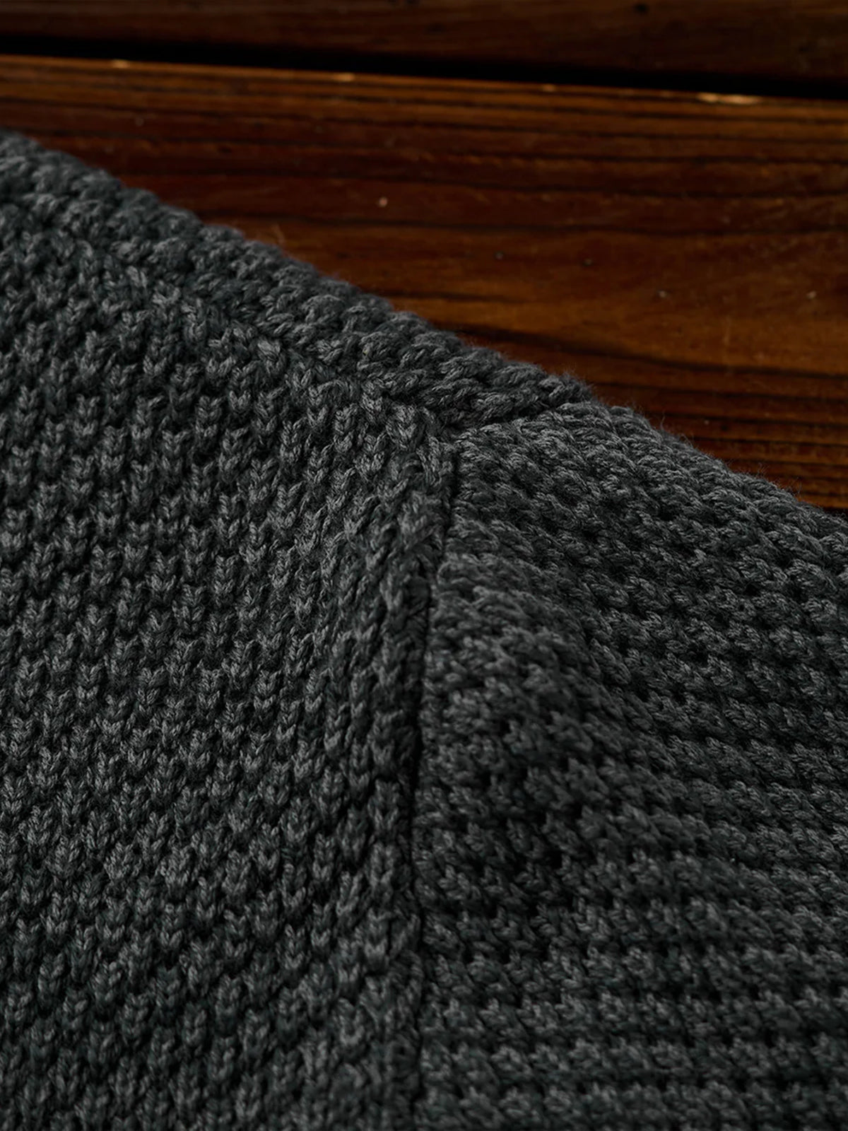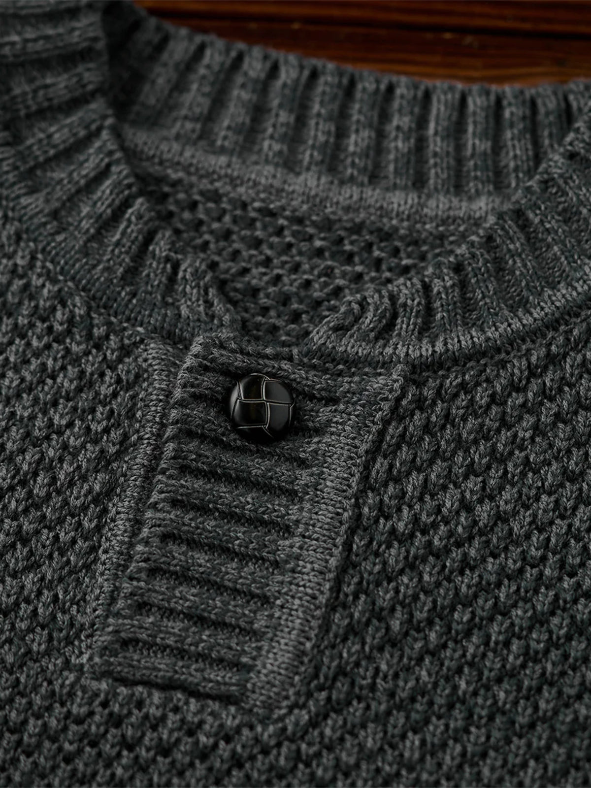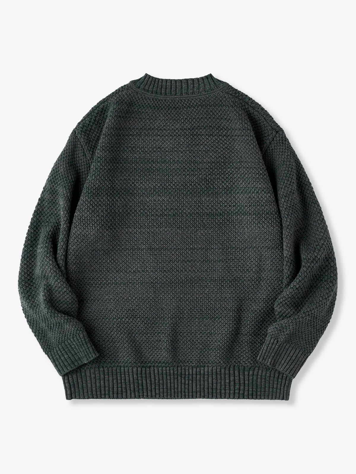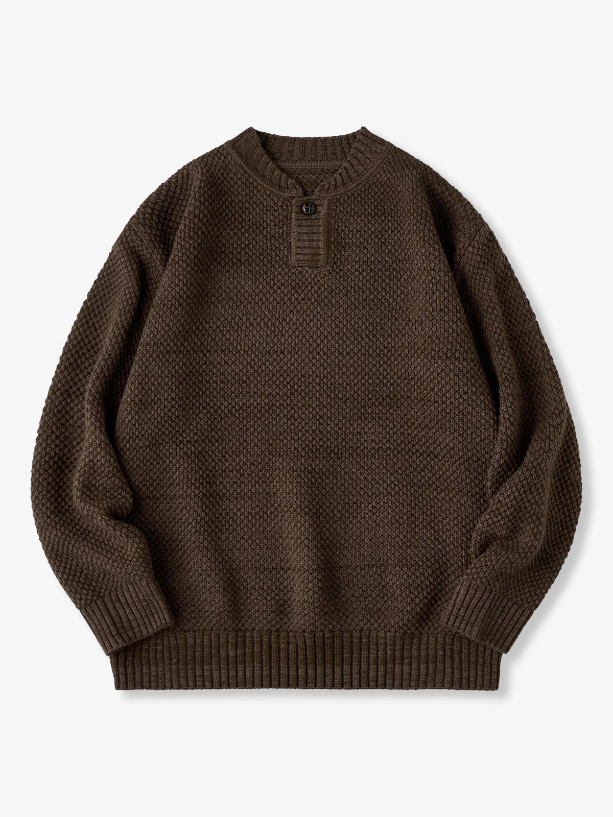 Featuring the textured detail of fine pineapple pile knitting, this sweater creates a soft, dimensional surface. The uniform stitch pattern gives a casual yet refined appearance. A single-button placket adds a minimalistic touch, making it versatile for both casual and slightly formal styles. Ribbed cuffs, hem, and neckline enhance the fit while maintaining overall design balance.