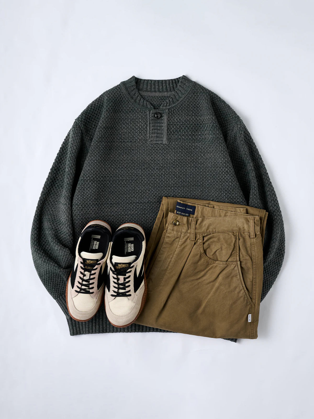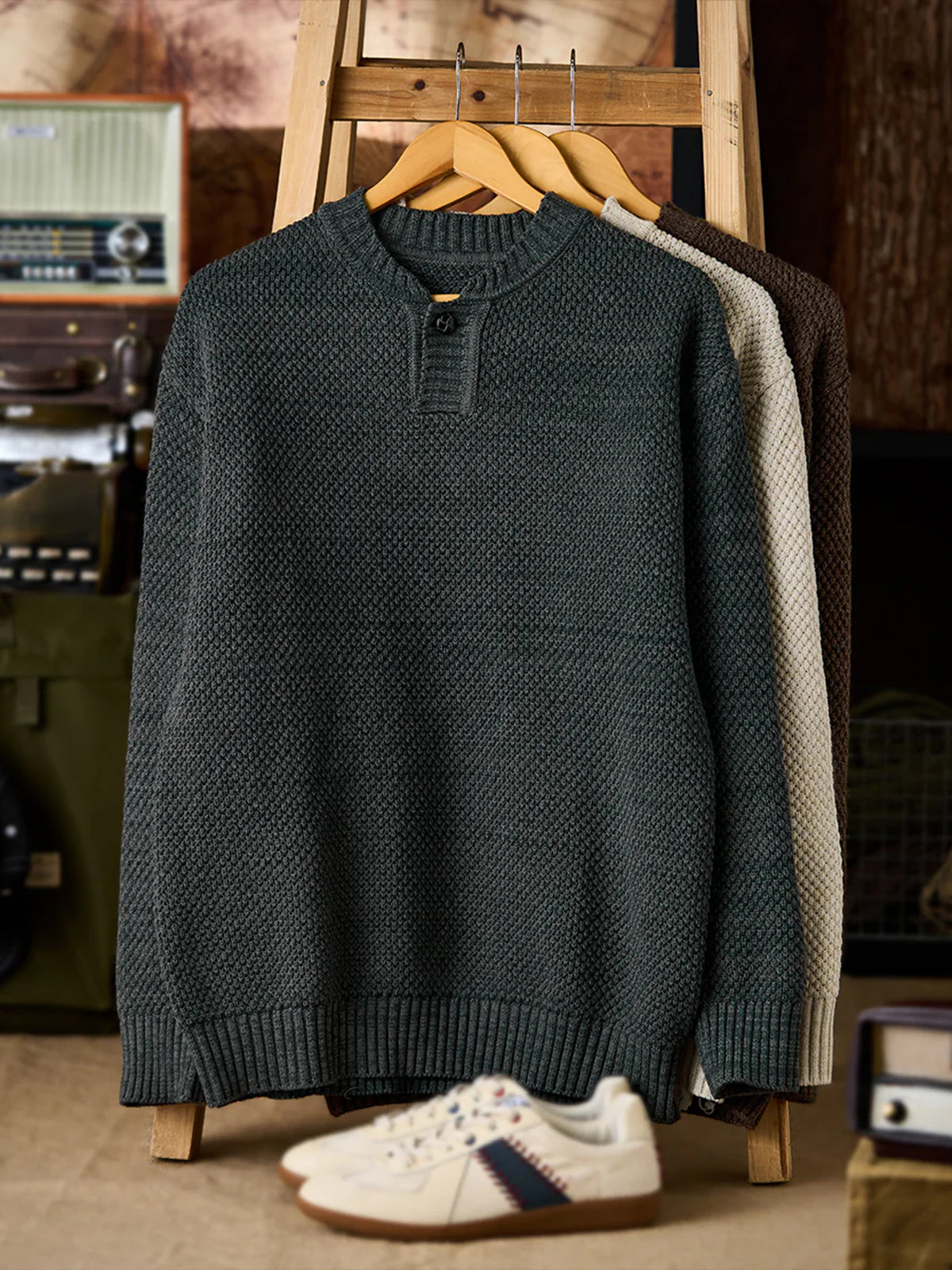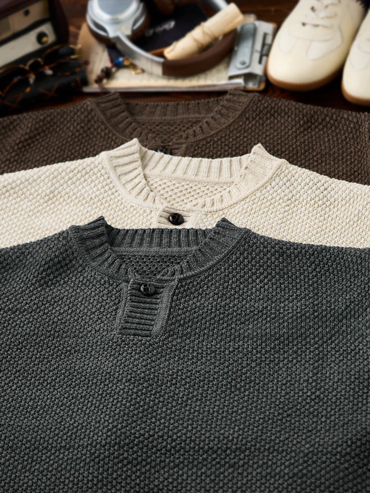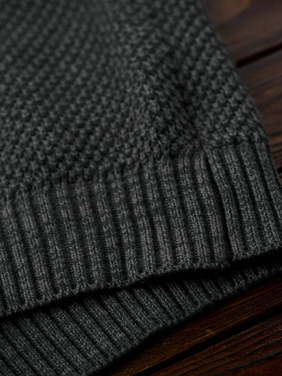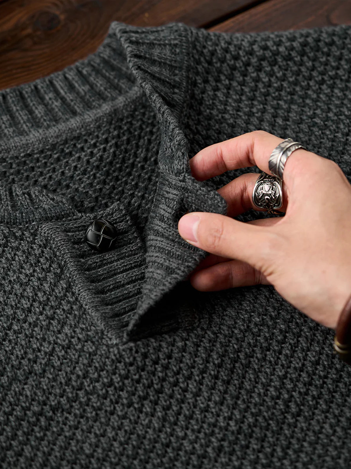 Featuring the textured detail of fine pineapple pile knitting, this sweater creates a soft, dimensional surface. The uniform stitch pattern gives a casual yet refined appearance. A single-button placket adds a minimalistic touch, making it versatile for both casual and slightly formal styles. Ribbed cuffs, hem, and neckline enhance the fit while maintaining overall design balance.