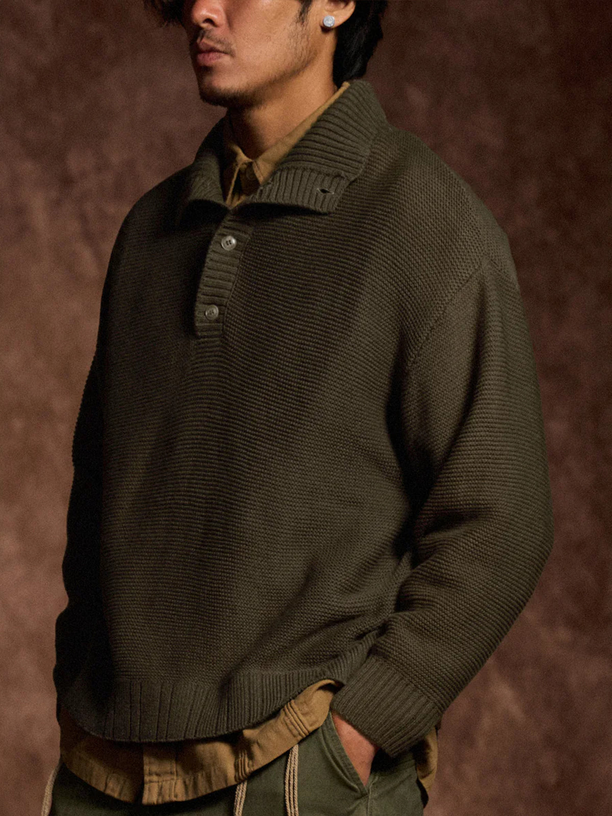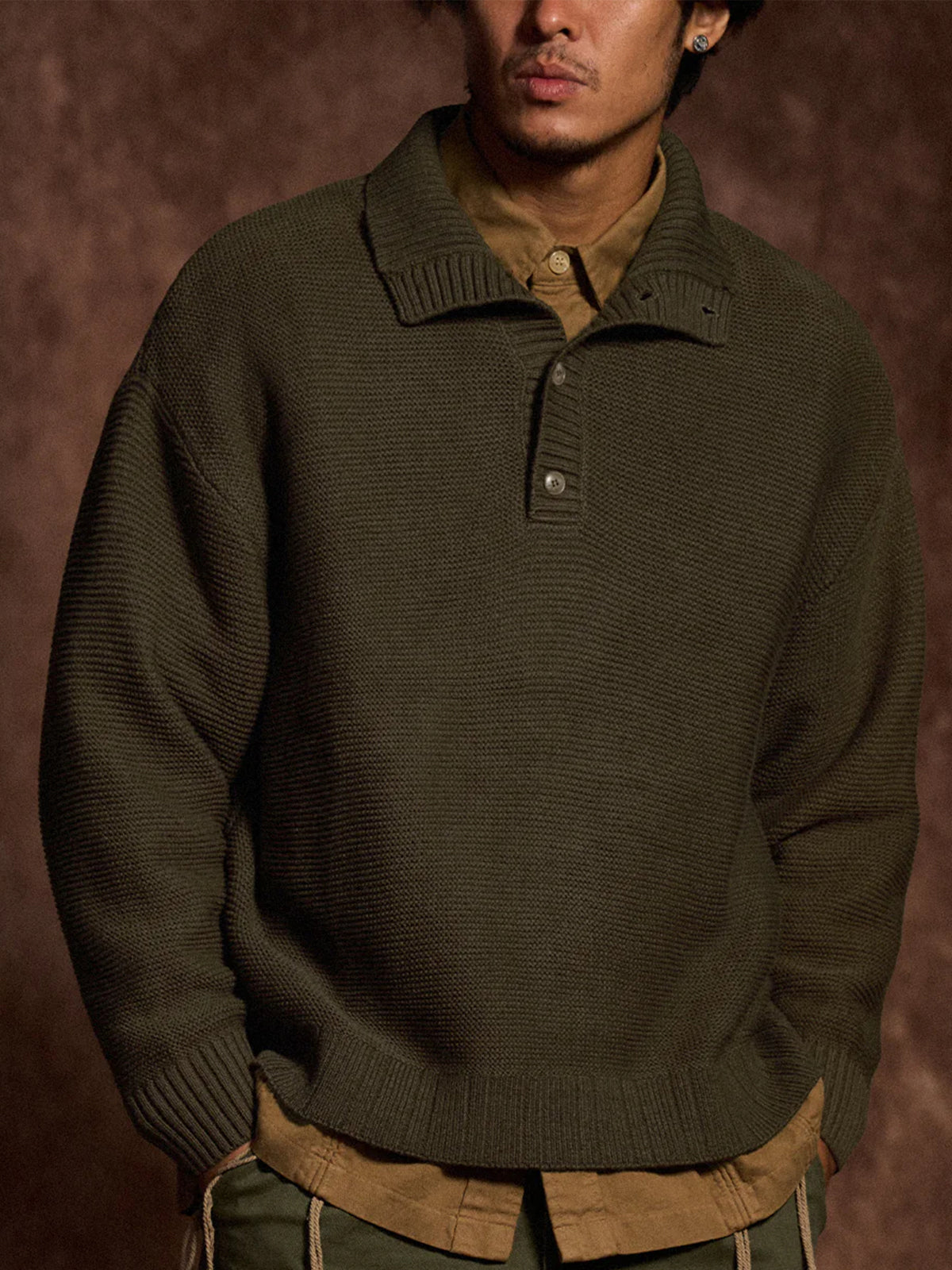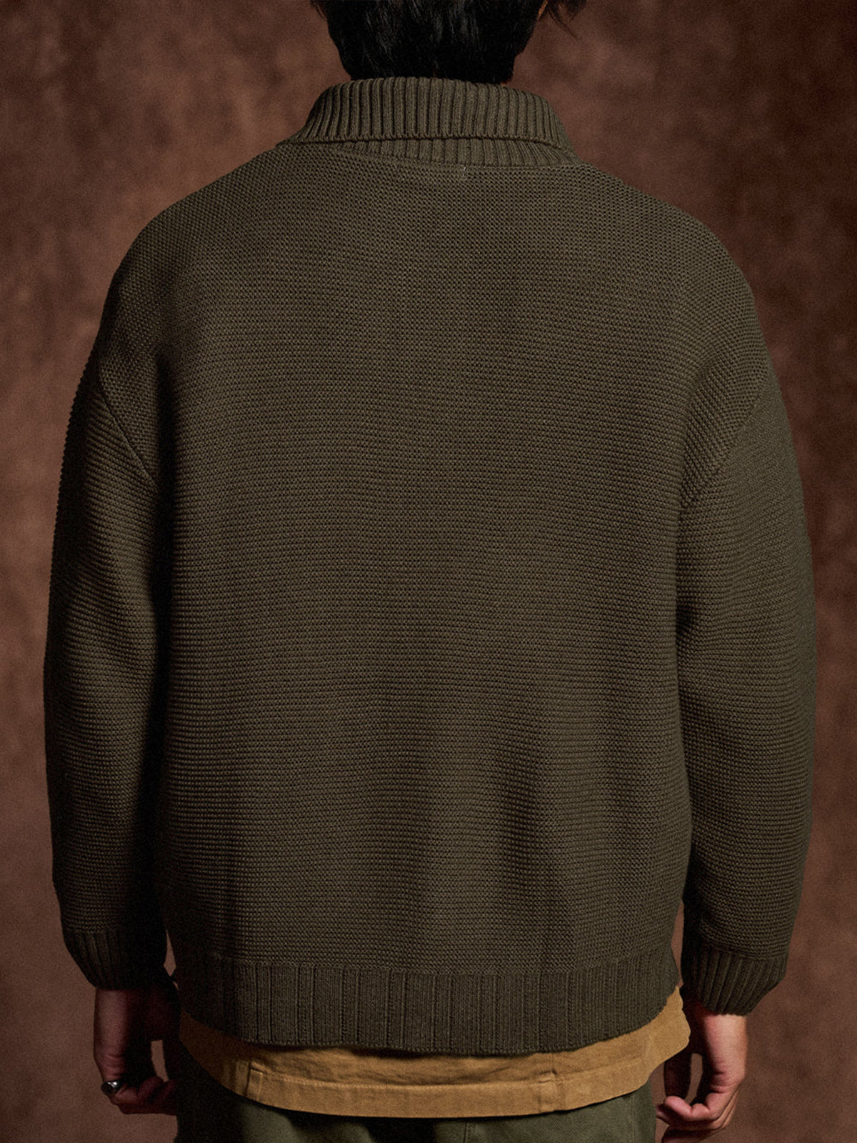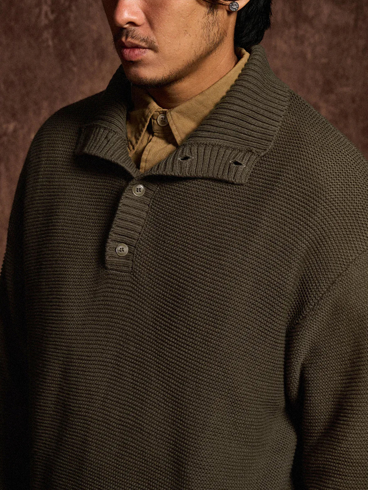A high-neck knit sweater finished with a three-dimensional pineapple pile knit for a rich, textured look. The plump knitted fabric traps air, offering a light yet warm feel. The collar features a 2-way design — button it up for a snug high-neck style, or open it for a natural fold-over collar silhouette, allowing you to adjust according to your mood or outfit. With its soft texture and moderate volume, this piece adds an elegant accent to your autumn and winter outfits.