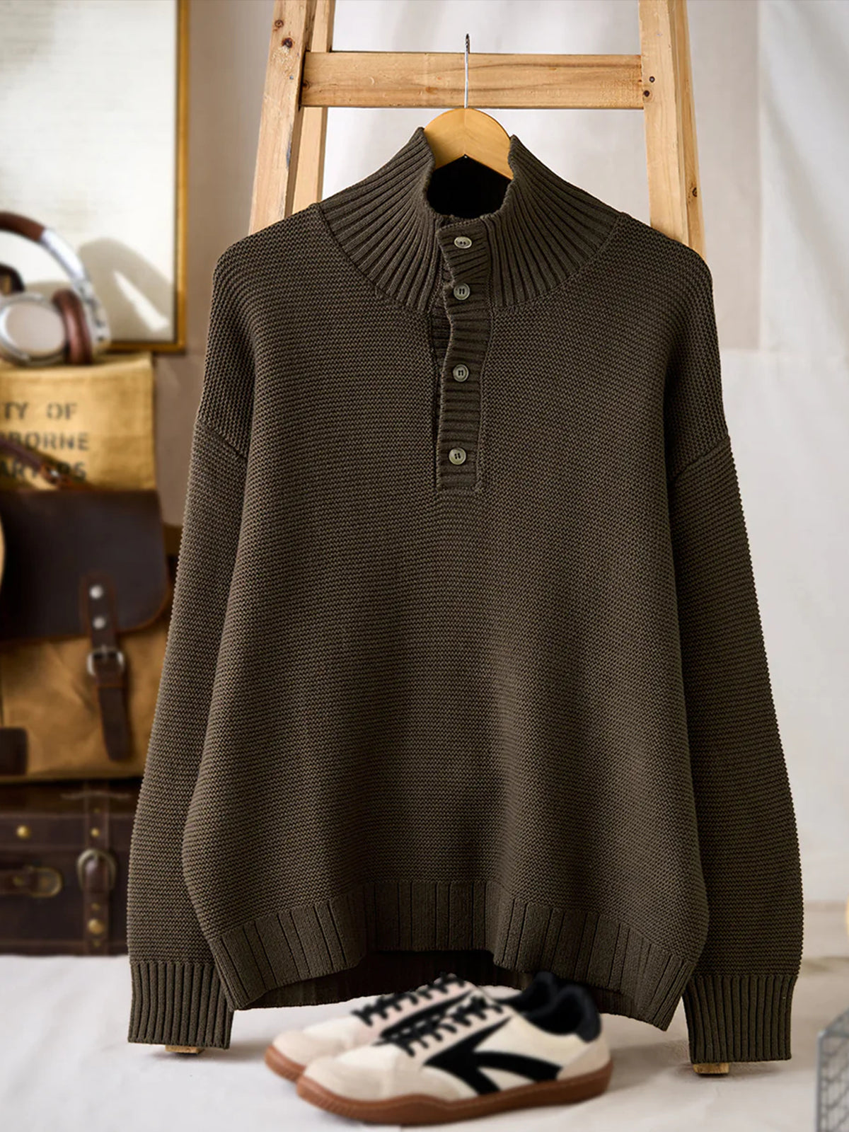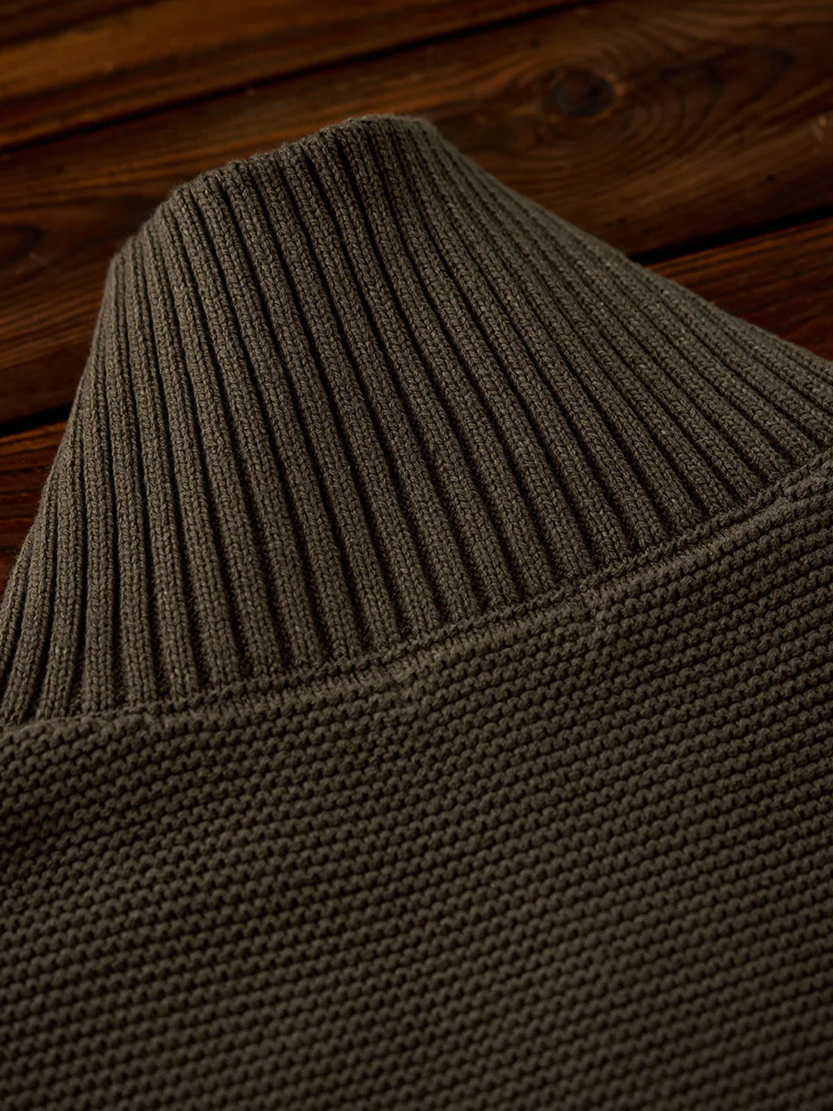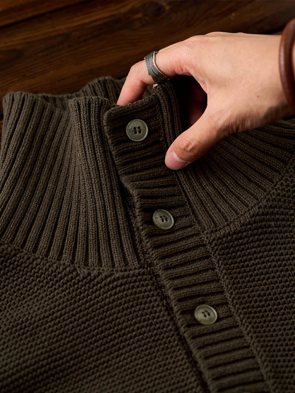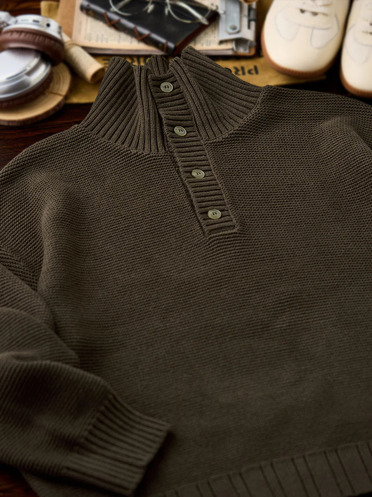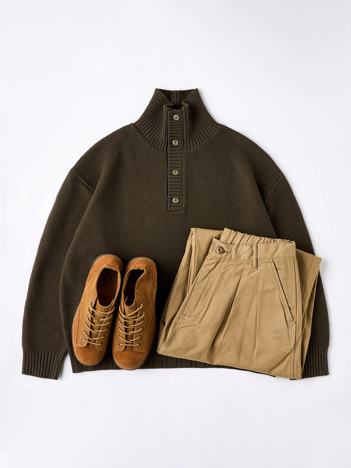 A high-neck knit sweater finished with a three-dimensional pineapple pile knit for a rich, textured look. The plump knitted fabric traps air, offering a light yet warm feel. The collar features a 2-way design — button it up for a snug high-neck style, or open it for a natural fold-over collar silhouette, allowing you to adjust according to your mood or outfit. With its soft texture and moderate volume, this piece adds an elegant accent to your autumn and winter outfits.