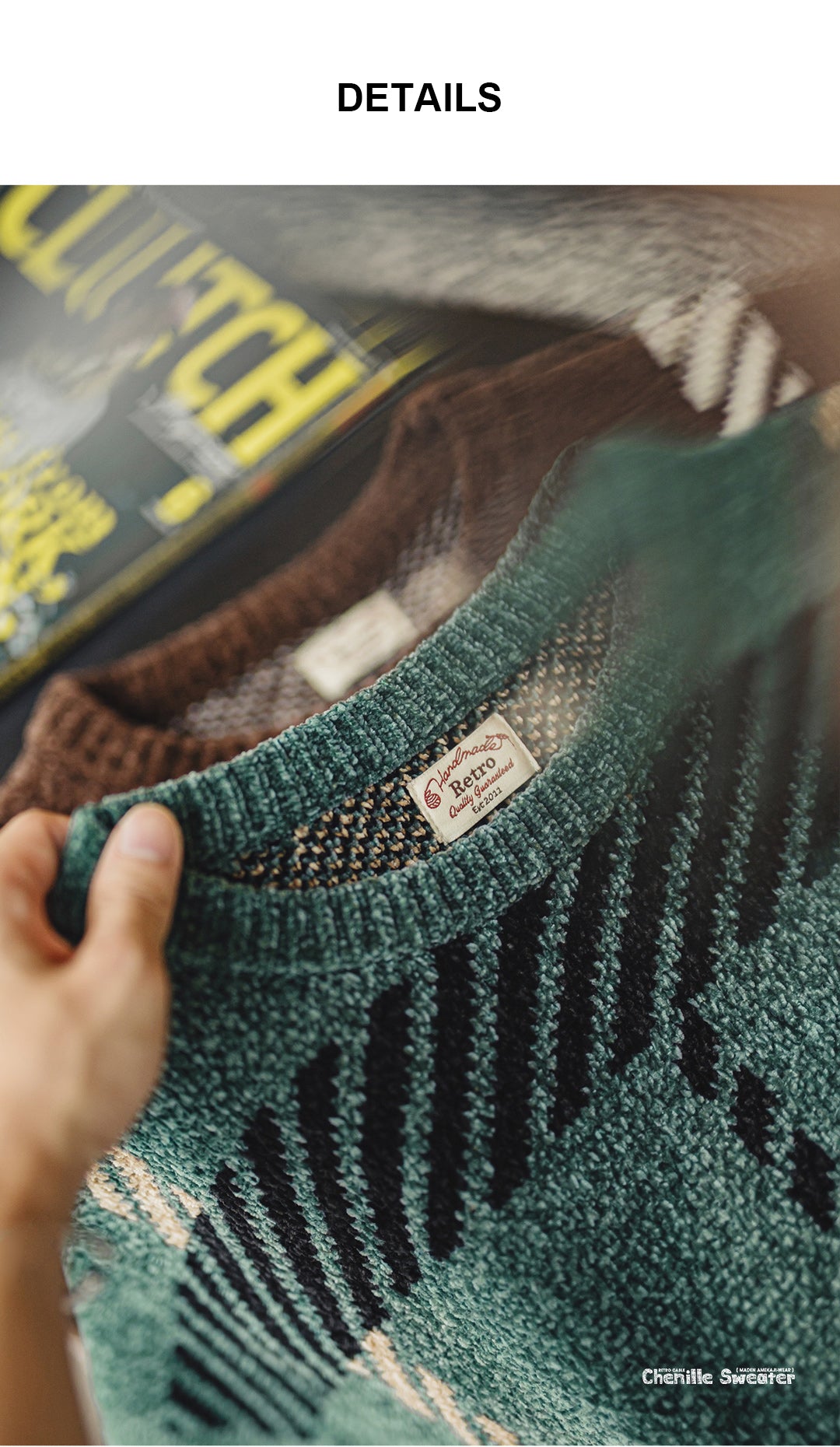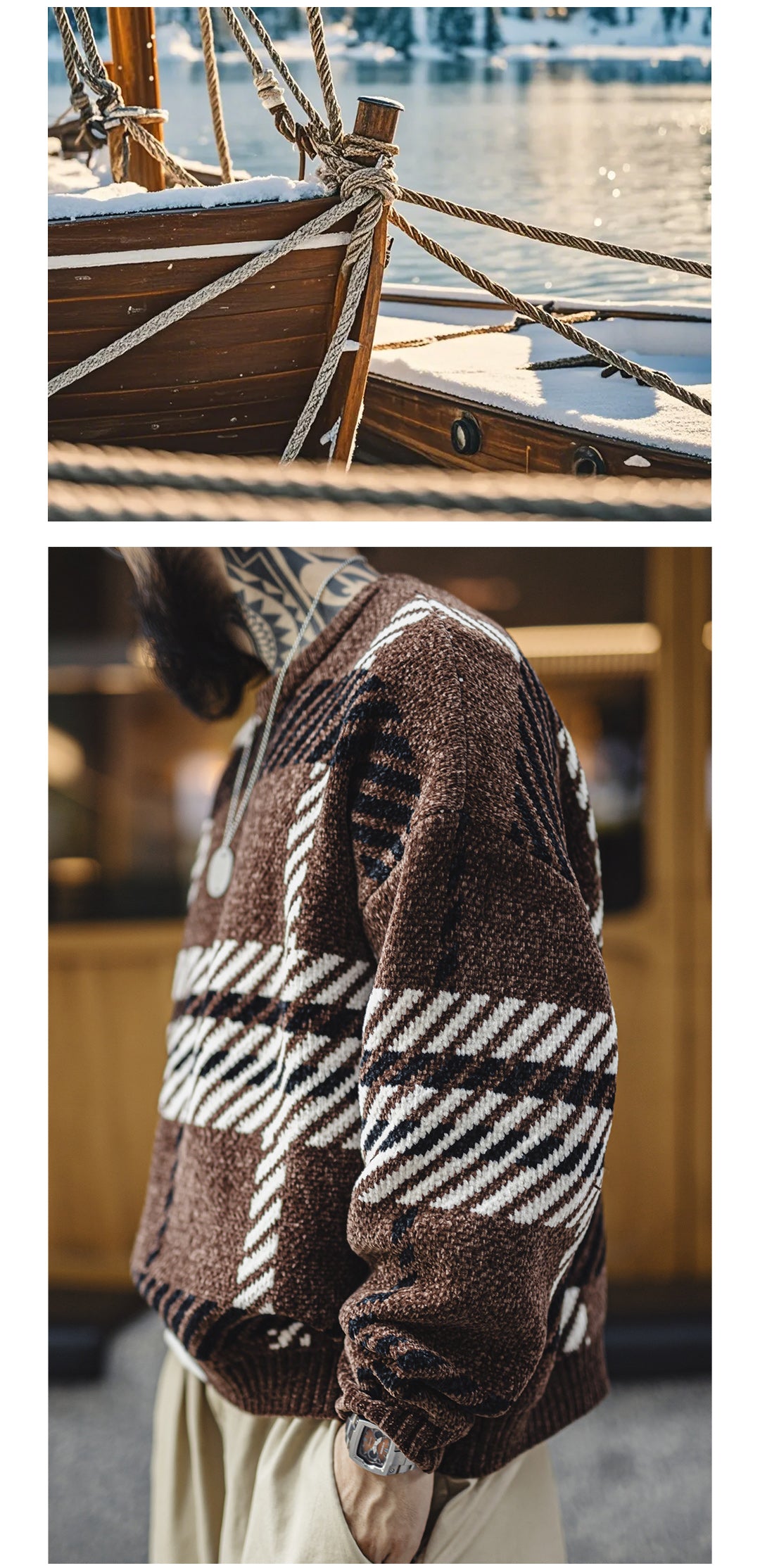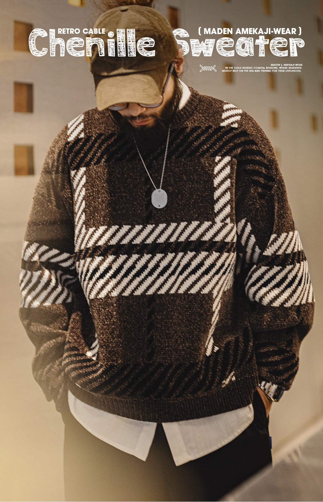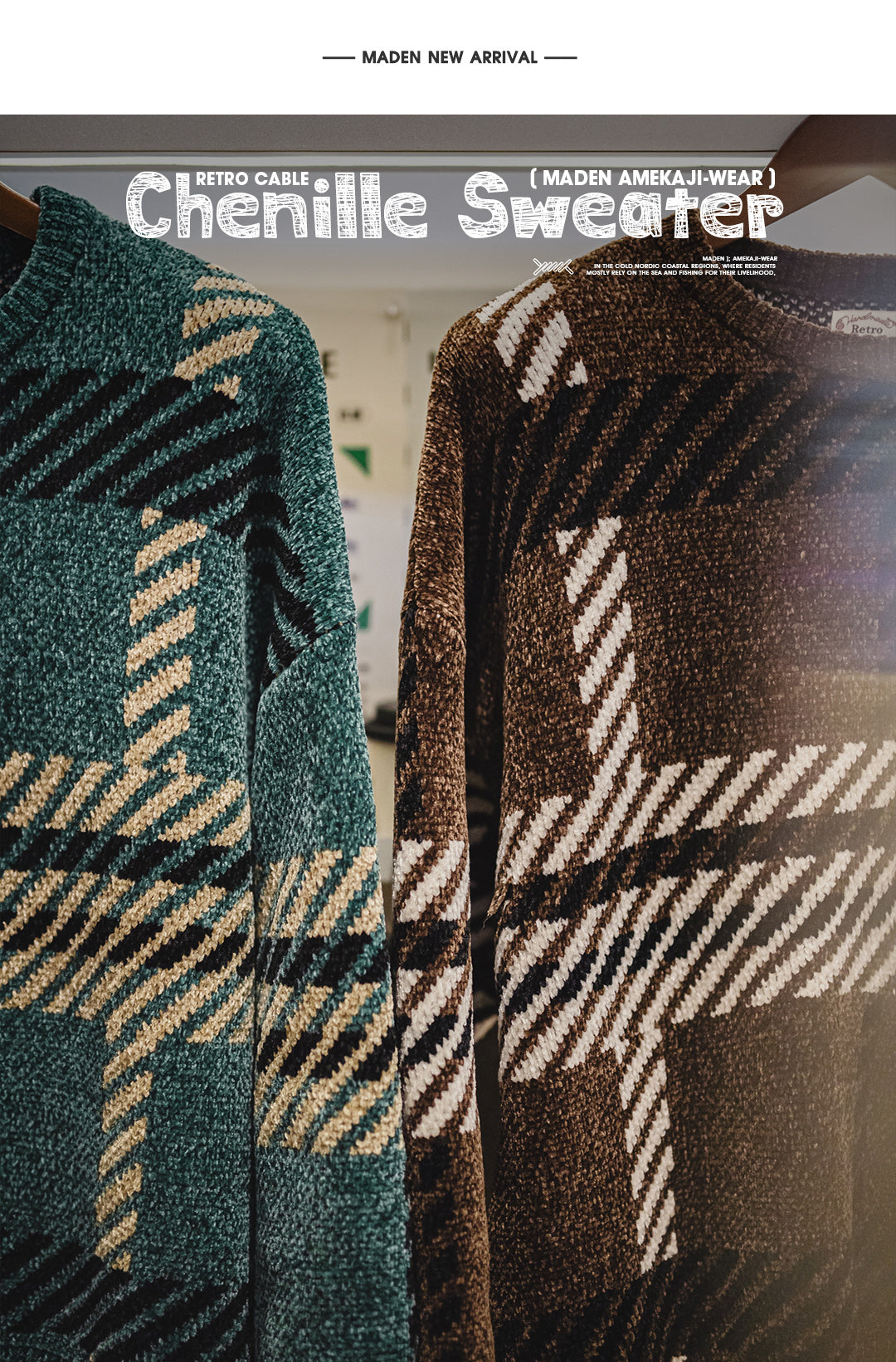 Features a classic nautical-inspired cable-knit pattern and is available in vintage green and brown colorways.