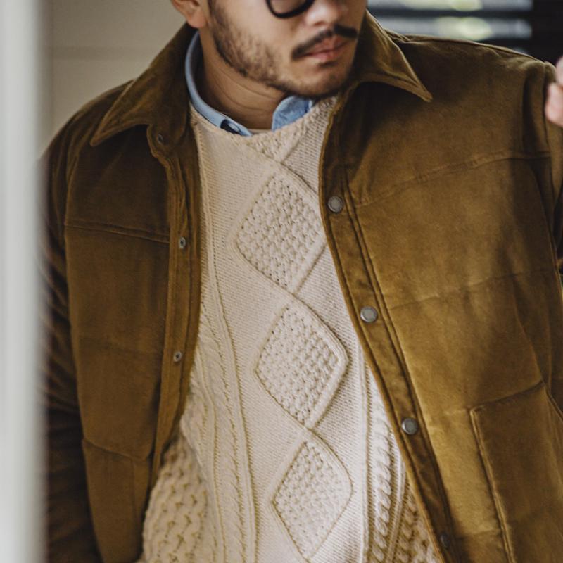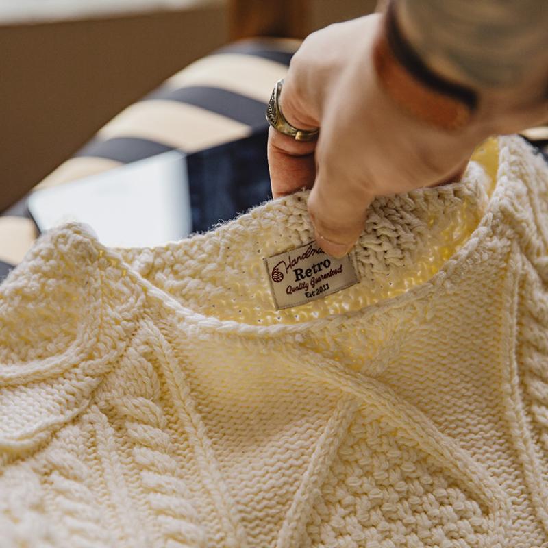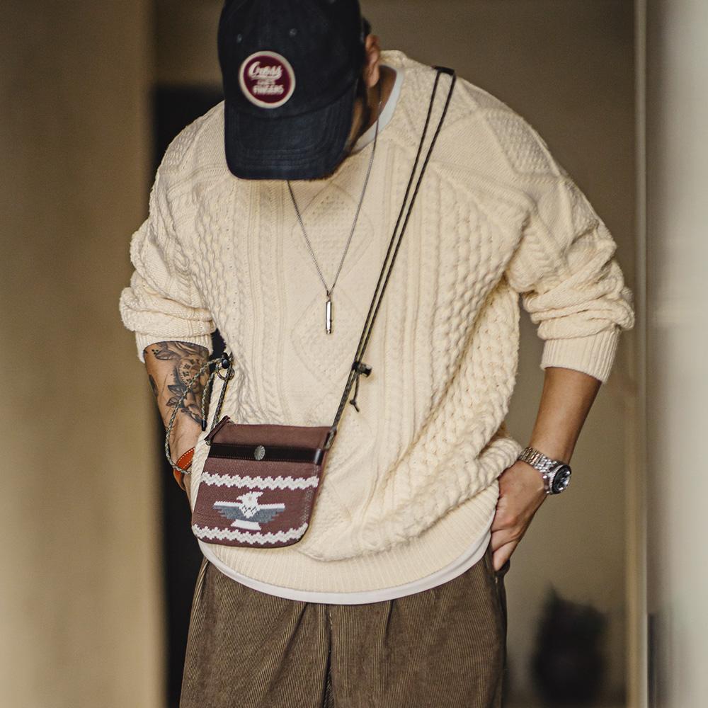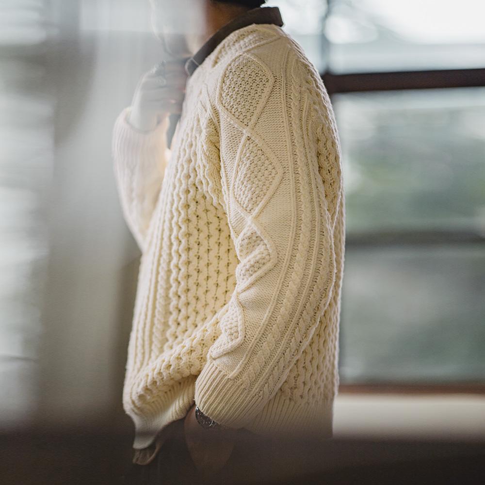 Men's Vintage Twisted Aran Sweater Round Neck White Knit Fisherman Pullover Autumn Winter Amekaji Woven Cable Jumper