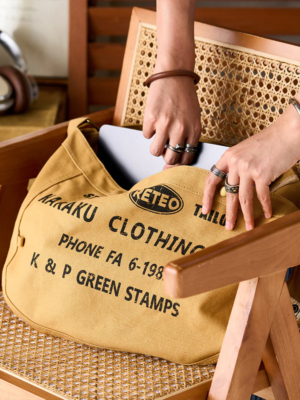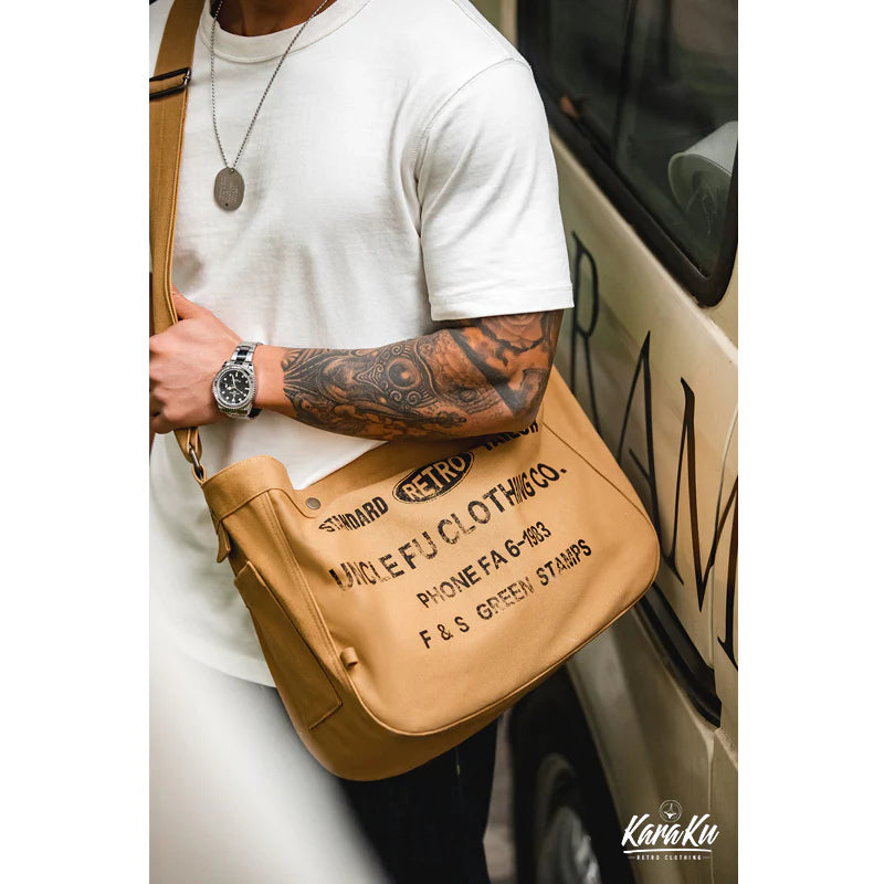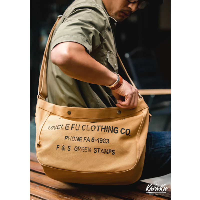 Inspired by the 1960s newspaper boy bag, this updated version features classic vintage graphics and a versatile design. With English letters on the front and a plain back, it offers dual styling options. The wide strap ensures a comfortable fit, and the cotton is durable and spacious. Ideal for everyday use, it combines vintage charm with practical functionality for various styles and seasons.