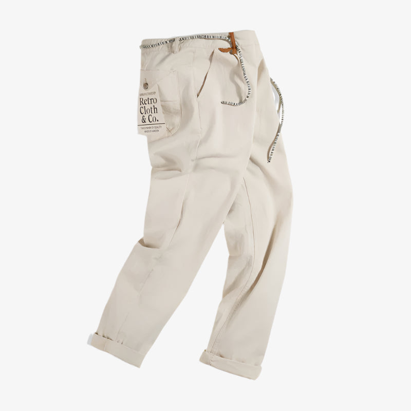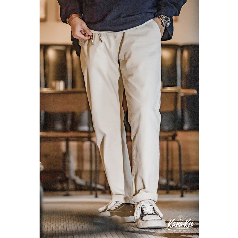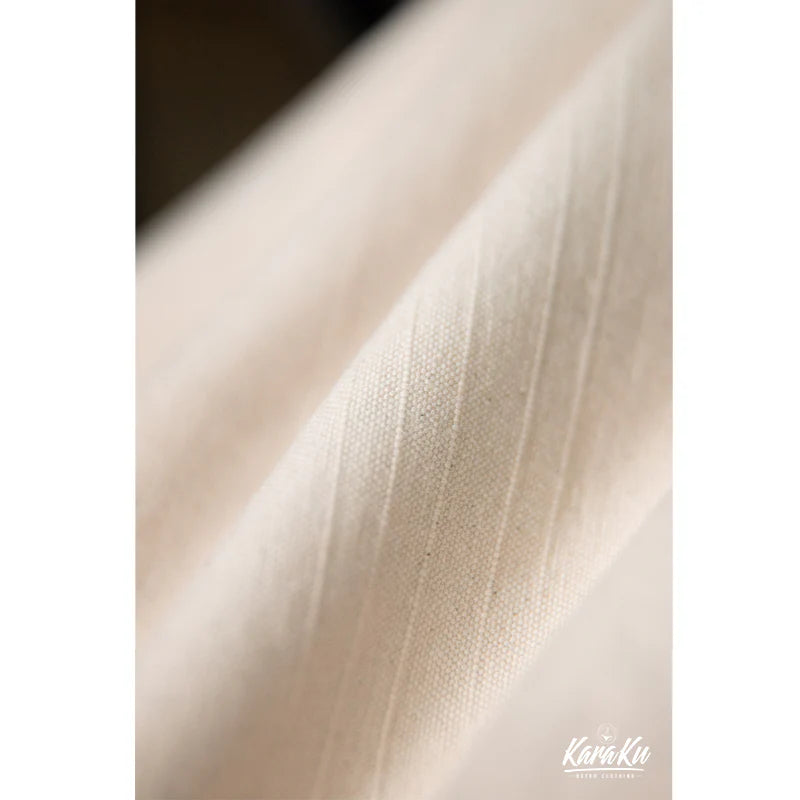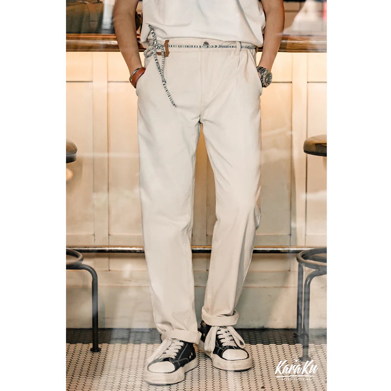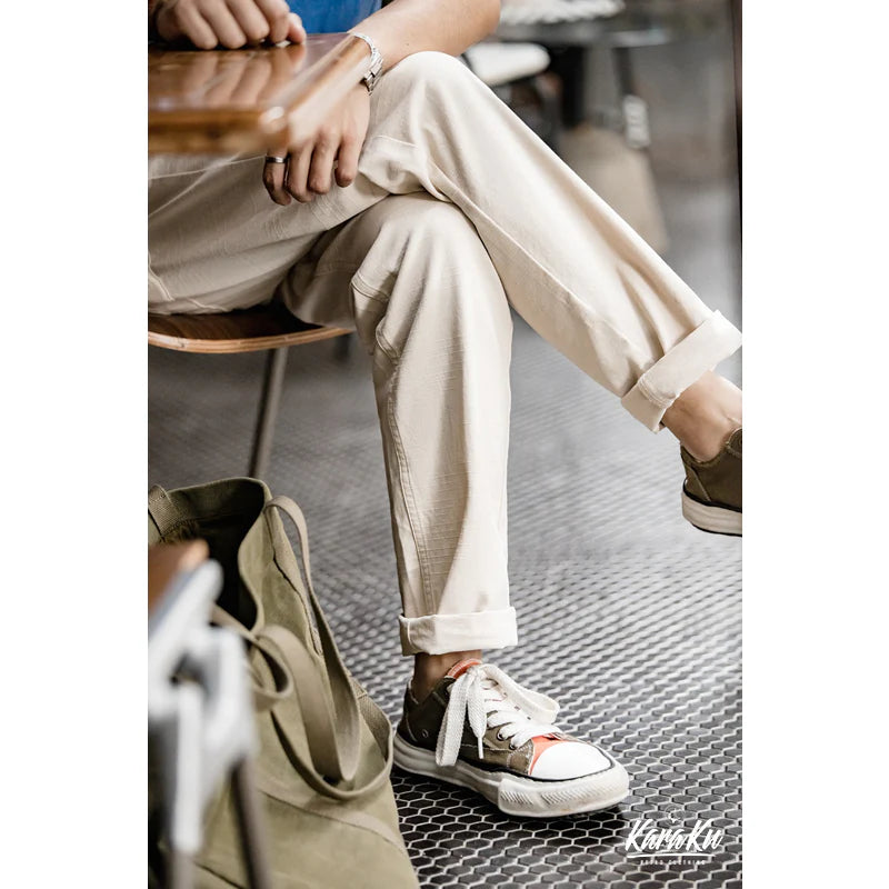 Featuring zippers and buttons, these white jeans have large front pockets and back patch pockets for functionality. Crafted from natural cotton canvas with a robust texture, they offer a vintage charm. The fabric retains cotton husks and seeds, adding to a natural feel. Finished with a wash for softness and wrinkle resistance, these slightly tapered straight-leg pants are versatile.