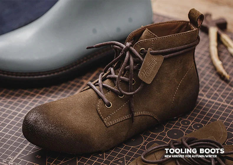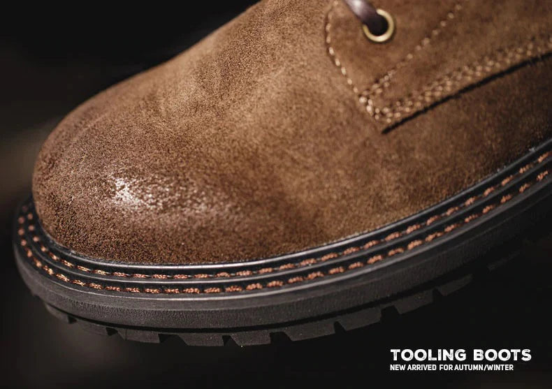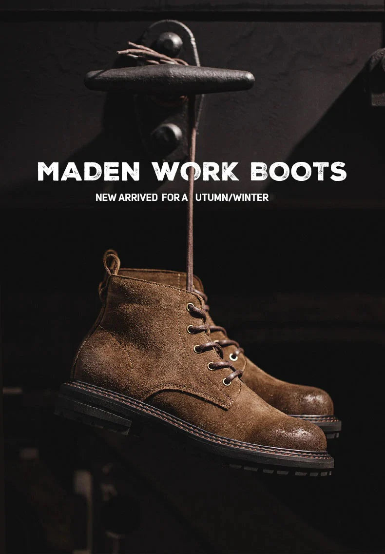 This season's work boot, crafted after multiple revisions in leather, craftsmanship, and design, embodies timeless style that ages beautifully with wear. Made from high-quality leather, it features durable double-stitched welt construction. Ideal for rugged environments or casual settings, these boots combine function and style, growing more unique over time.