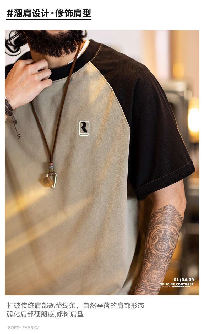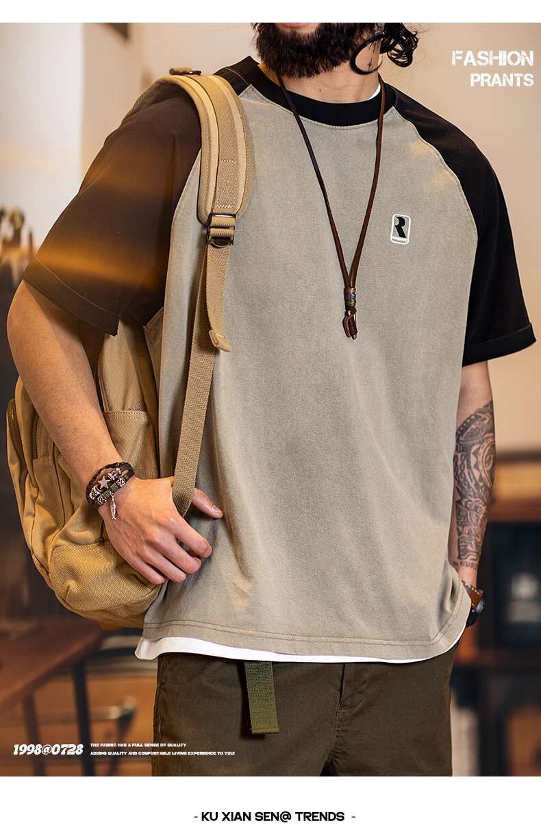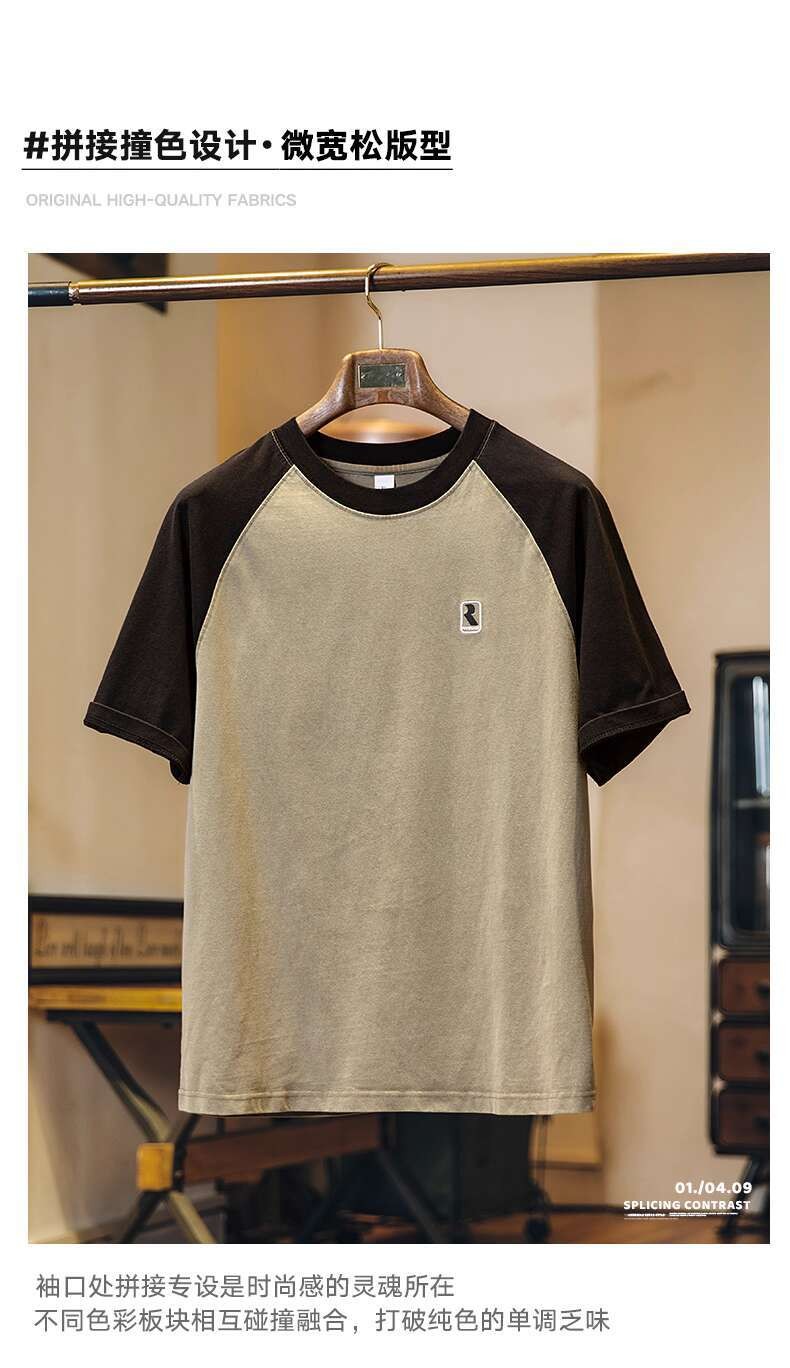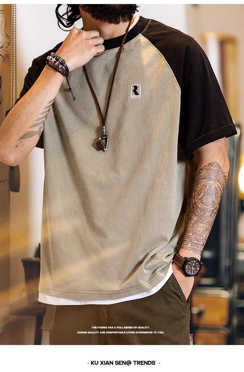 2025 Summer New Style Pure Cotton Short-Sleeved t-Shirt Men Slightly Loose American Casual Half-Sleeved Contrast Color Round Neck Top Men Style