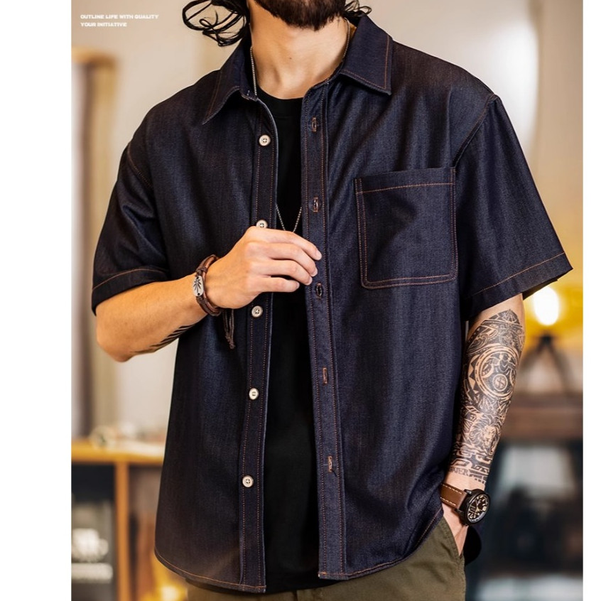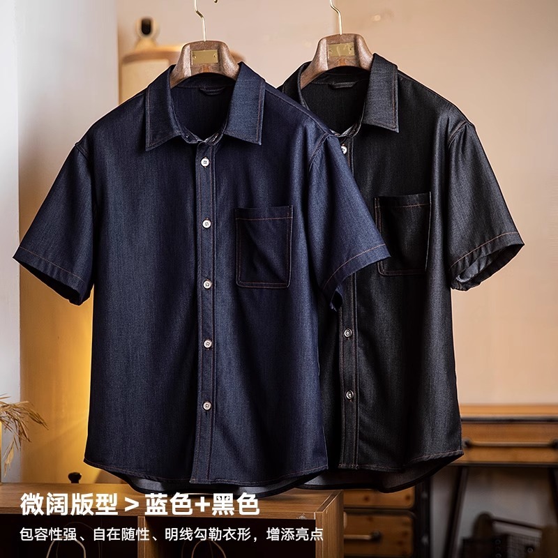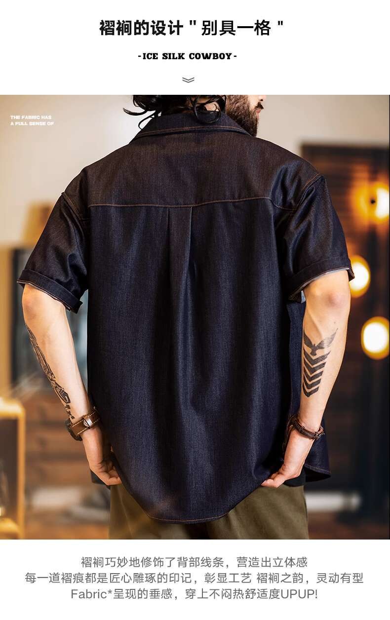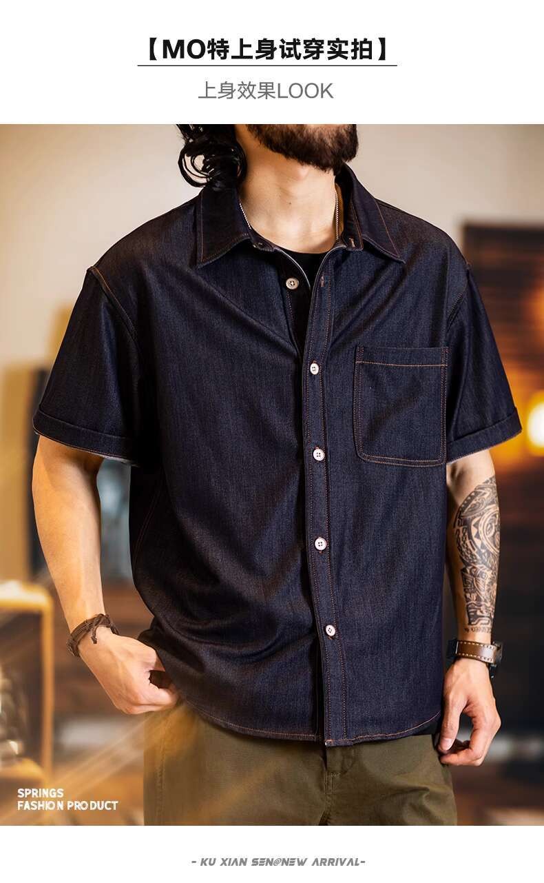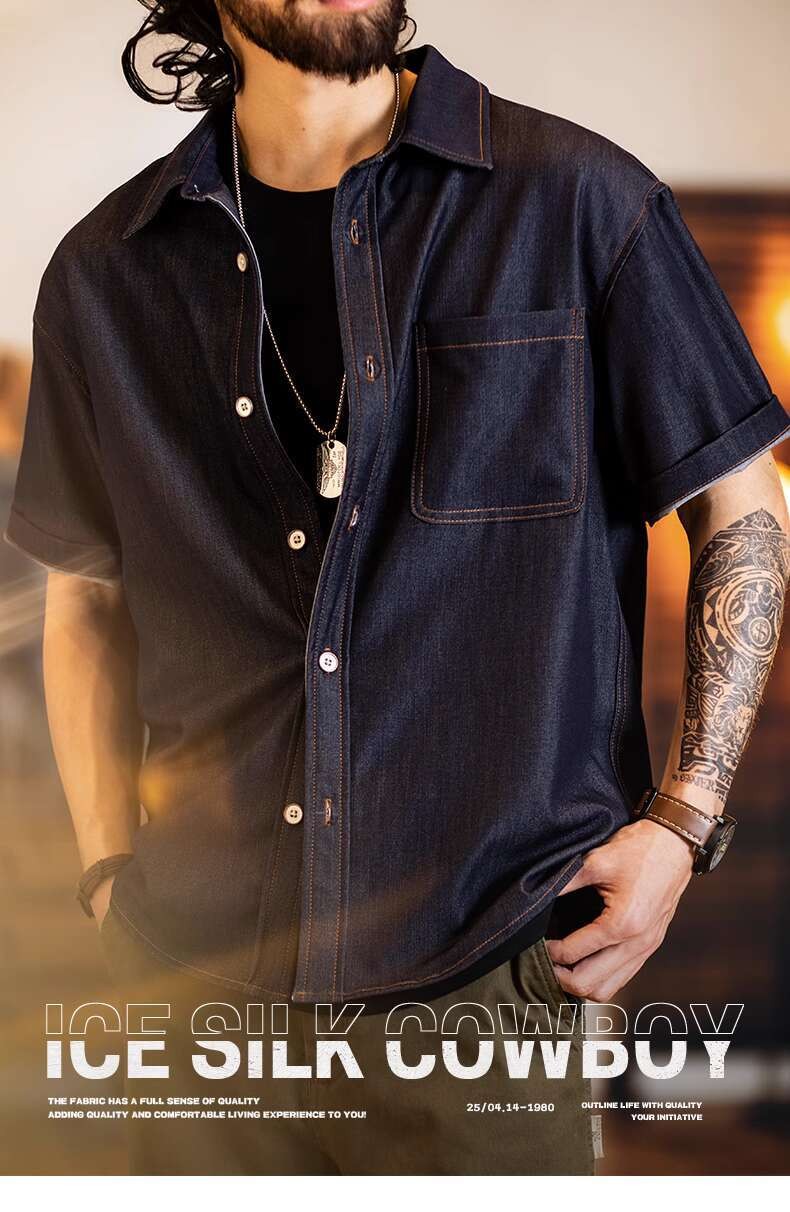 Wuluwear American Denim Shirt Men's Short-Sleeved 2025 Summer New Style Stretchy Slightly Loose Thin Half-Sleeved t-Shirt Men