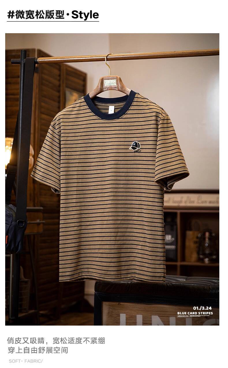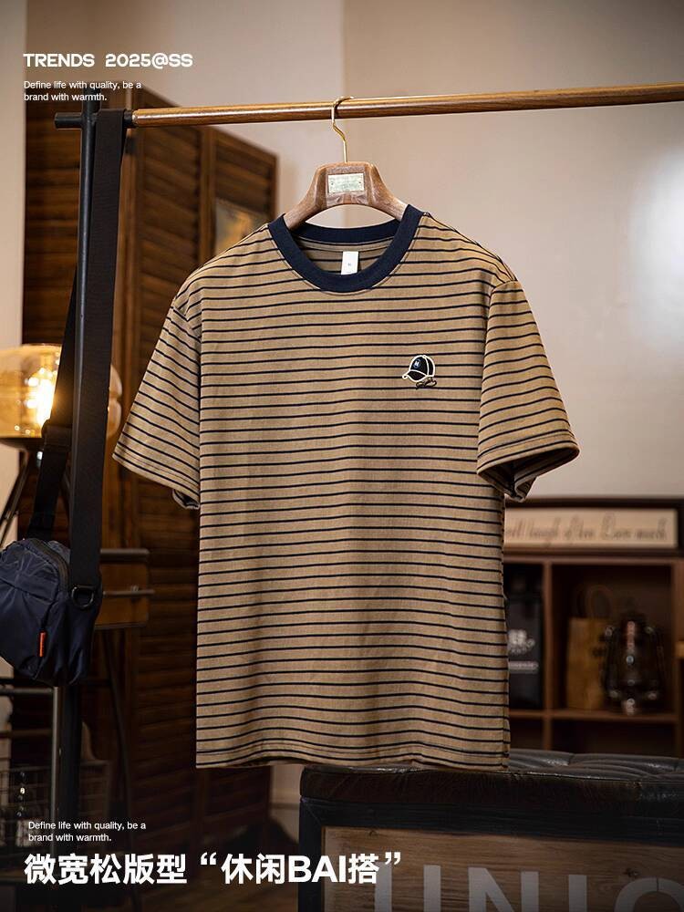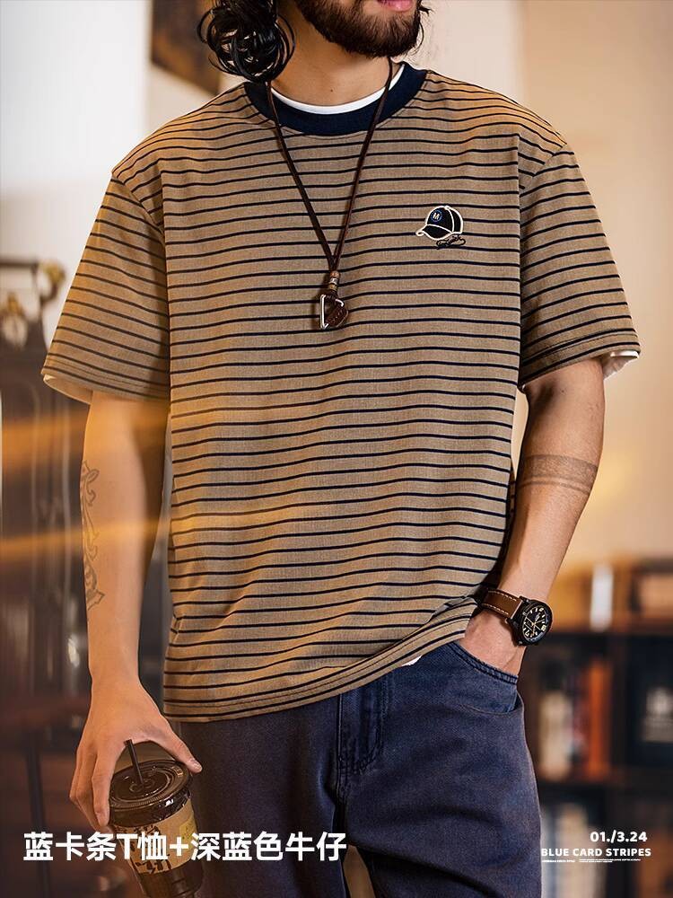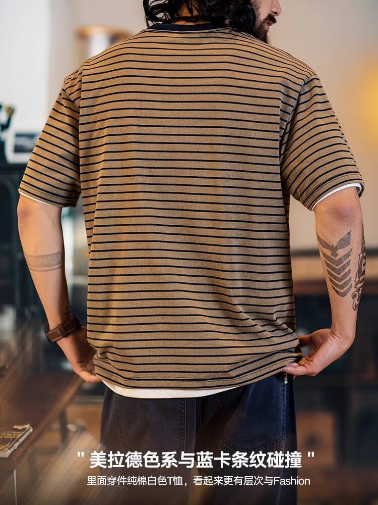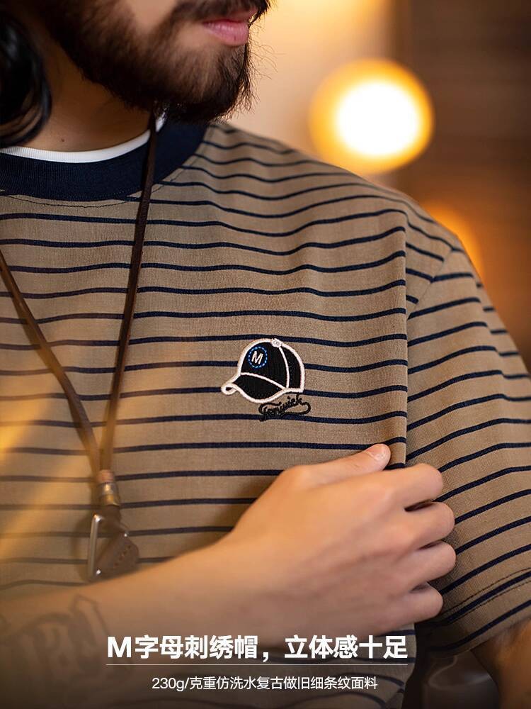 American Pinstripe Short-Sleeved T-Shirt Men 2025 Summer New Style Embroidered Imitation Washing Distressed Half-Sleeved Men's Summer