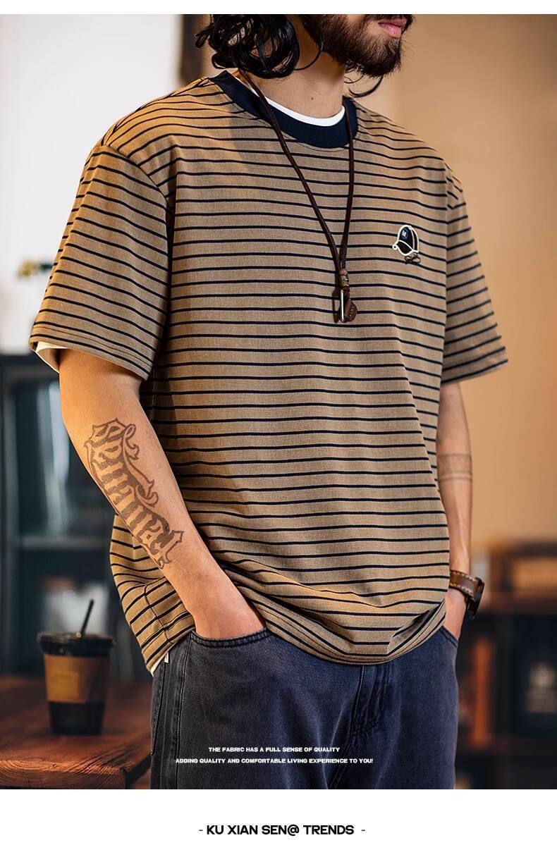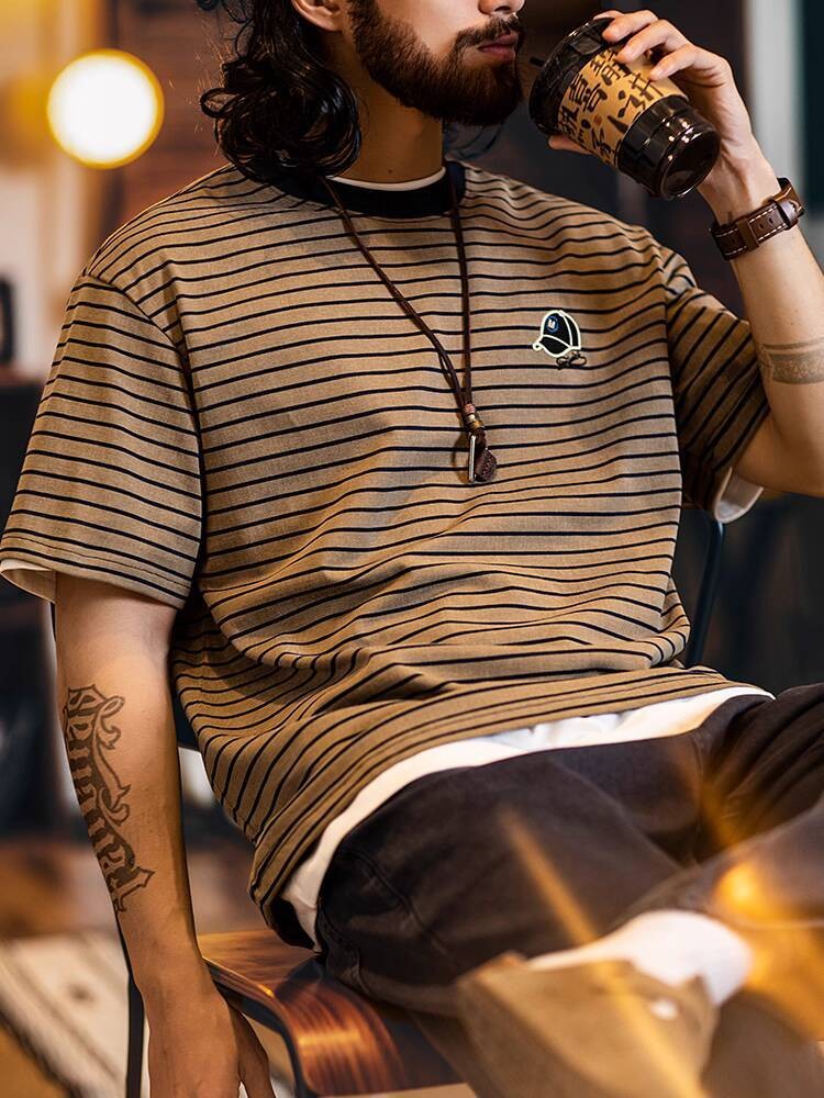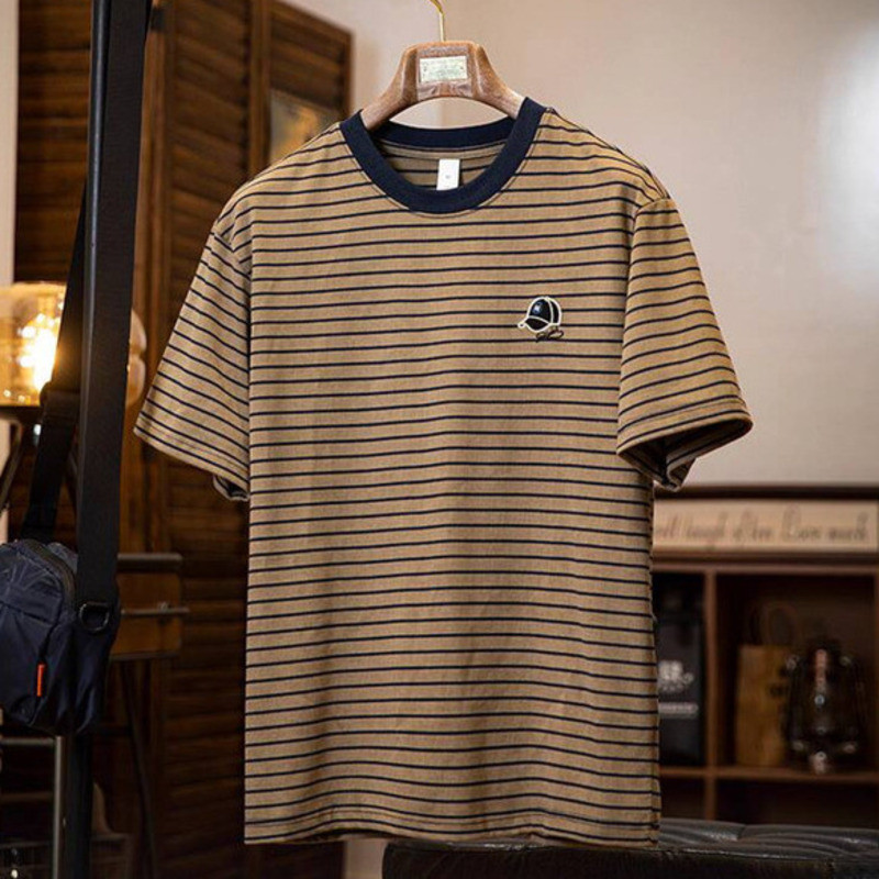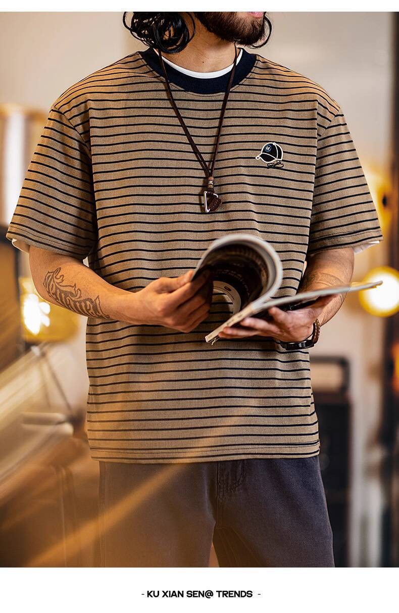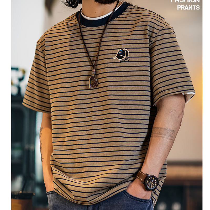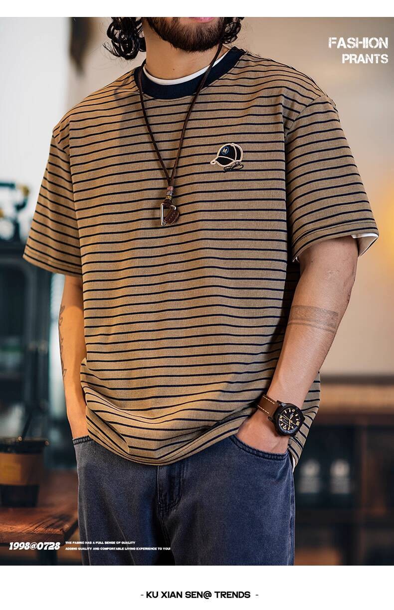 American Pinstripe Short-Sleeved T-Shirt Men 2025 Summer New Style Embroidered Imitation Washing Distressed Half-Sleeved Men's Summer