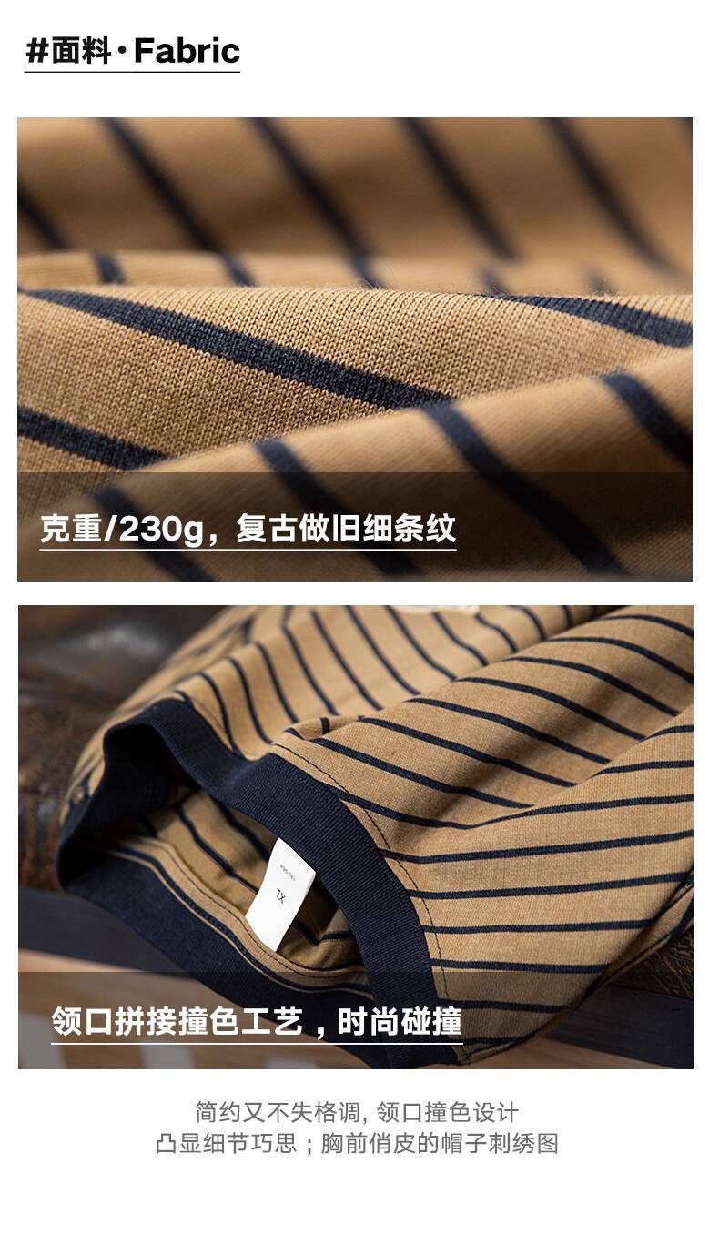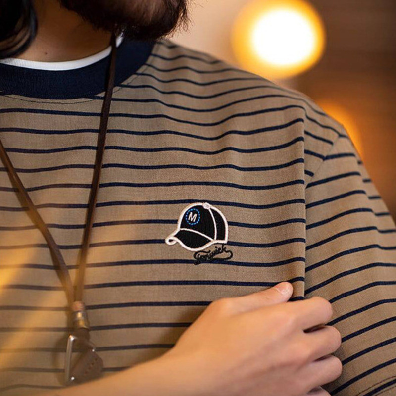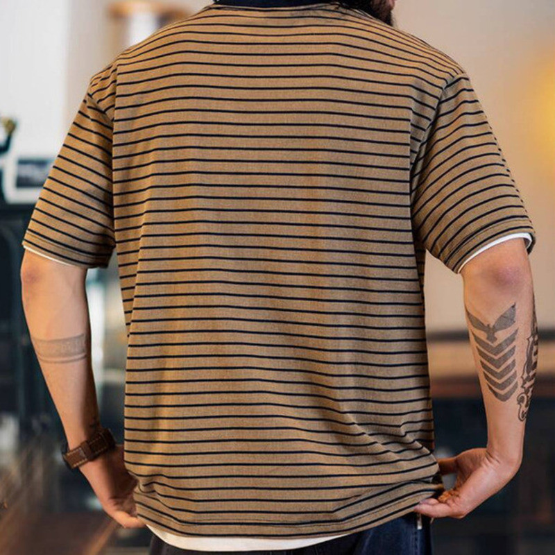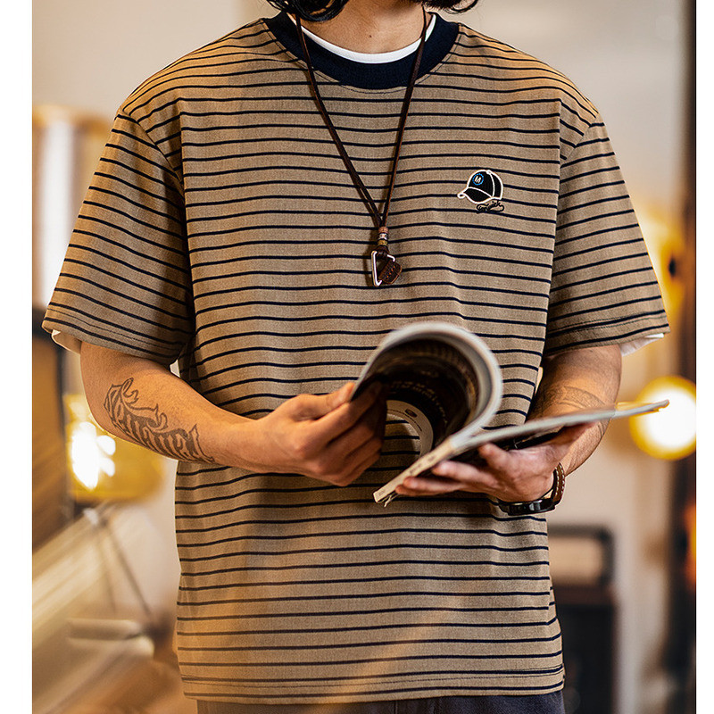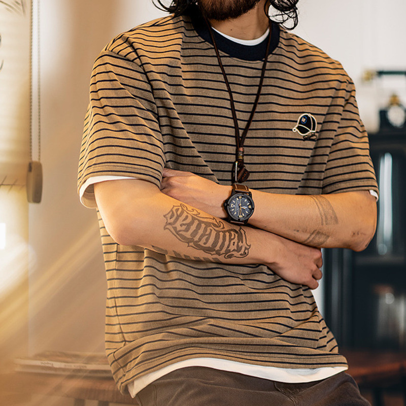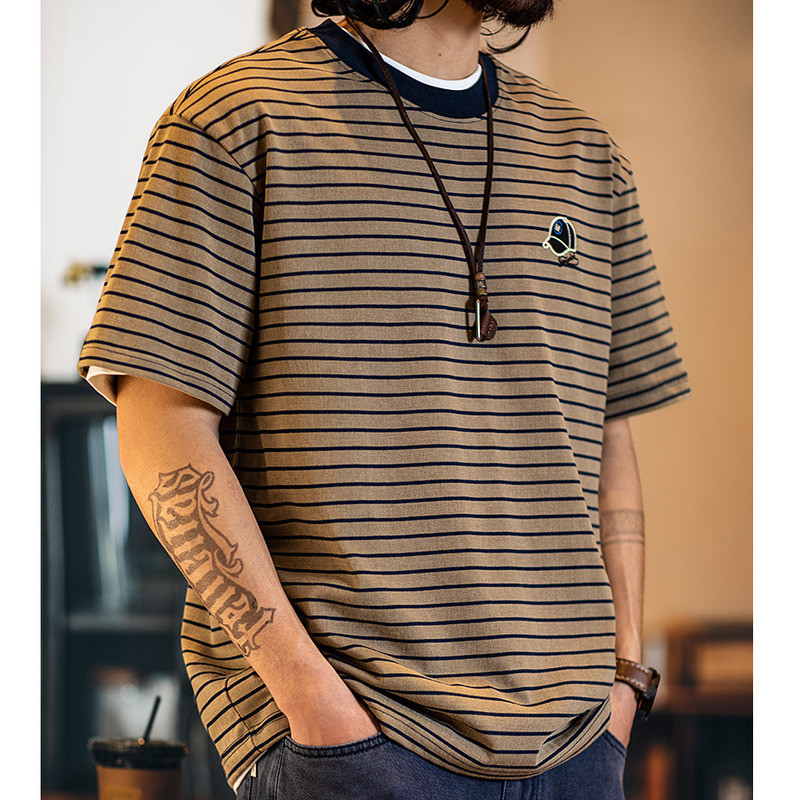 American Pinstripe Short-Sleeved T-Shirt Men 2025 Summer New Style Embroidered Imitation Washing Distressed Half-Sleeved Men's Summer
